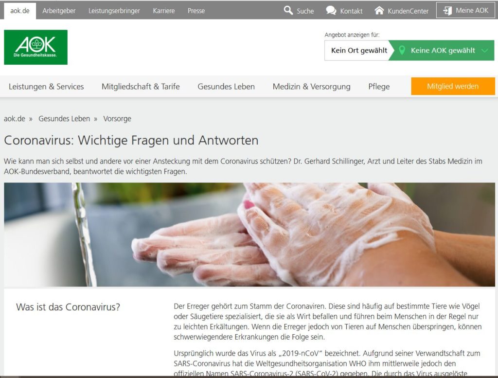 Selbstverständlich befasst sich auch die Gesundheitskasse intensiv mit dem Coronavirus. Auf ihren Seiten findet ihr wichtige Fragen und Antworten, Tipps, wie man eine Ansteckung vermeidet oder Links zu den Seiten des Bundesgesundheitsministeriums, des Robert-Koch-Instituts, zu Hygieneempfehlungen in verschiedenen Sprachen oder zum AOK-Medienservice mit Interviews und Audiobeiträgen.