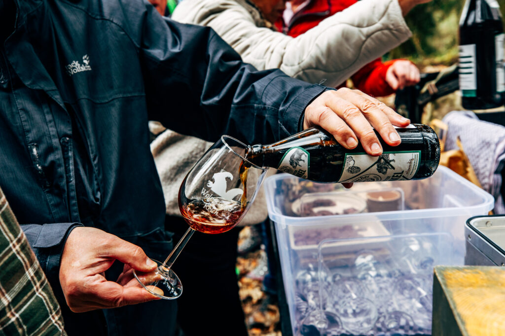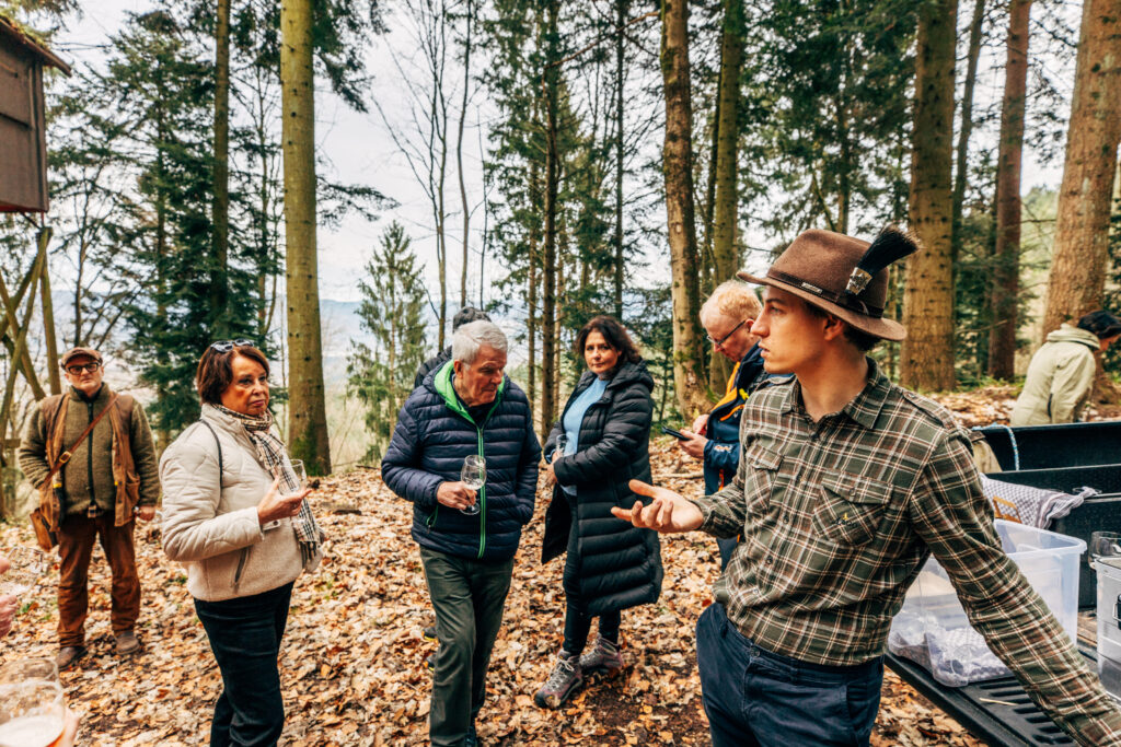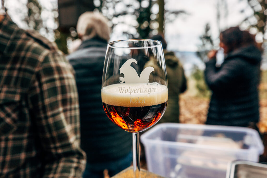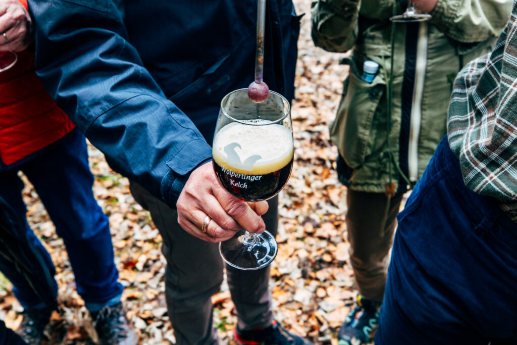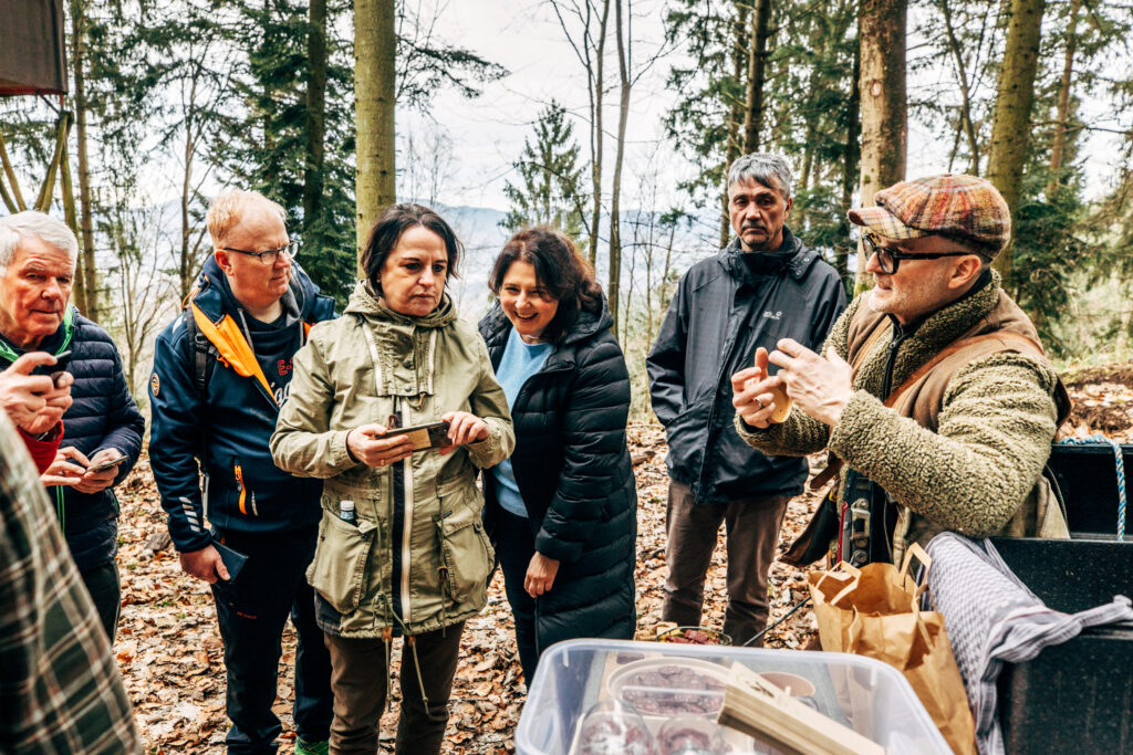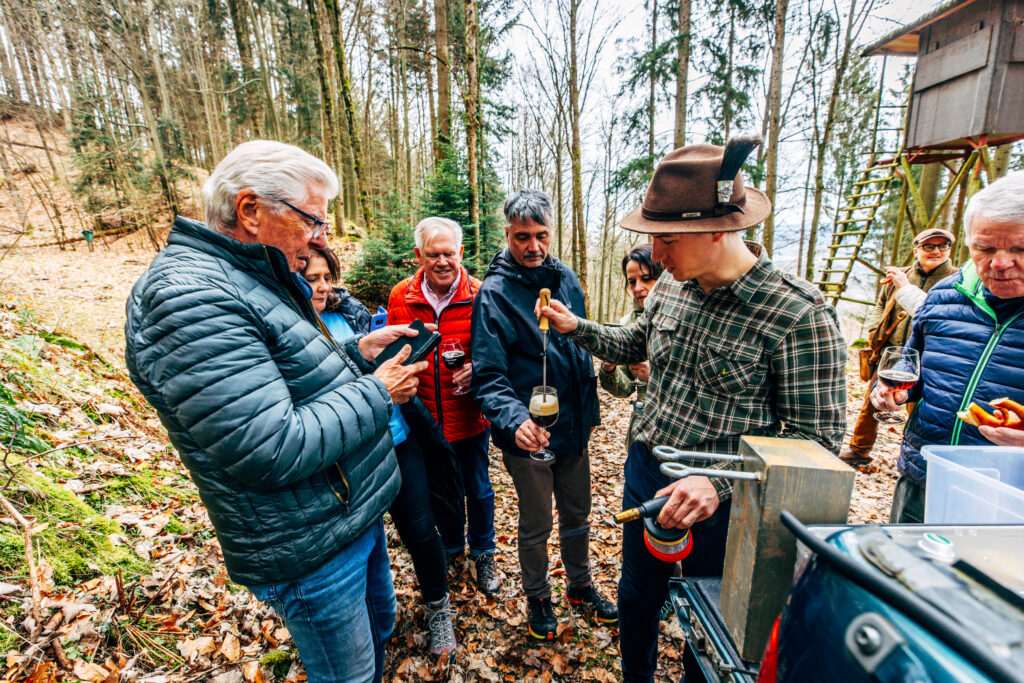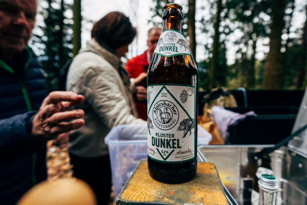 Angekommen am Zielpunkt des Pirschgangs, einem Hochsitz im Jagdrevier Ebersteinburg in Baden-Baden erläuterten Tom Stolz und Dominik Rahner den Ablauf der Jagd. Vom Ansitzen auf dem Hochsitz, oft mehrere Stunden, über den Schuss, bis zum Aufbrechen und der Reifungszeit des Wildfleischs. Selbiges galt es dann auch vor Ort in Form von Salami oder Schinken direkt zu probieren. Passend dazu gab es das malzige Schwarzbier unseres Naturpark Partners Alpirsbacher, welches vor dem Trinkgenuss jedoch „gestachelt“ wurde. Beim Stacheln wird ein heißglühendes Eisen in ein kühles Bier (6-7 °C) getaucht. Durch die Hitze karamellisiert der Zucker und der Schaum steigt auf. Dadurch verändert sich nicht nur die Temperatur, vielmehr entsteht ein ganz besonderes karamelliges Geschmackserlebnis.