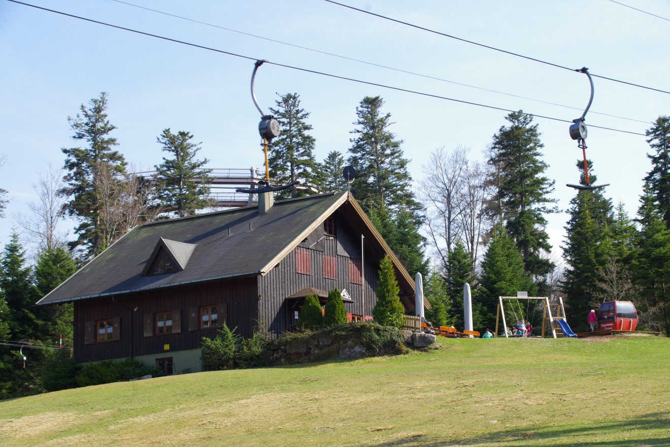 Weiter geht es geradeaus, bis wir an einen Skihang mit Bügellift gelangen. Überall grünt es, aber der Lift ist in Betrieb. Und nun sehen wir, dass sich Mountainbiker heraufziehen lassen. Denn am oberen Ende ist der Start zu einem der größten Bikeparks Deutschlands für die Fans von DirtJump, Biker-X, Dual-Slalom, Northshore-Trail, Freeride oder Downhill. Hier befindet sich auch die ganzjährig bewirtschaftete Skihütte. Wir könnten uns ja schon stärken, aber allzuviel haben wir uns noch nicht bewegt… Eine Weile schauen wir fasziniert den Kapriolen und rasanten Hindernisfahrten der Biker zu, dann queren wir sicher den Skihang und tauchen wieder in den Wald ein.