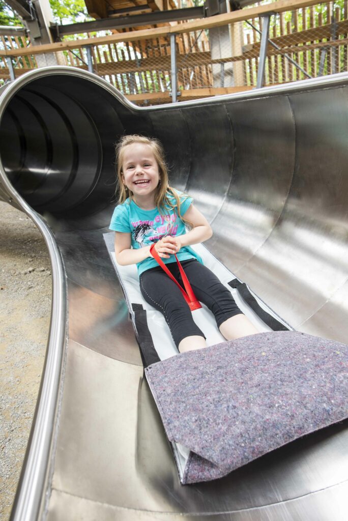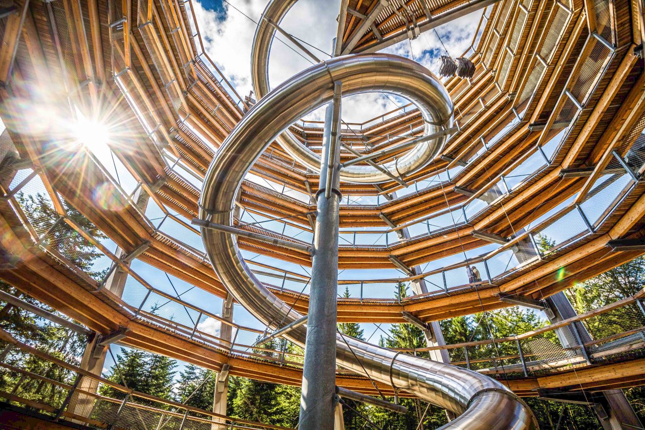 Das macht Freude: Auf über 8.000 Quadratmetern warten mehr als 20 abwechslungsreiche in den Wald integrierte Spiel- und Lernstationen für Groß und Klein. Neben Spielplatzklassikern wie Schaukeln und kleinen Rutschen gibt es auf dem Gelände mehrere spektakuläre Spielgeräte. So können Kinder und Eltern zum Beispiel gemeinsam auf einer großen Seilbahn gegeneinander um die Wette rutschen. Direkt daneben können Kinder und jung gebliebene Erwachsene abheben: Die Trampolinfläche ist 15 Meter lang und elf Meter breit! Doch nicht nur der Körper kommt zum Einsatz, sondern auch der Kopf: Wie auch auf dem Baumwipfelpfad gibt es verschiedene Lernstationen, an denen die Kinder Wissenswertes über den Wald und seine Bewohner lernen können. Das Highlight der Anlage, eine mehrstöckige Kletterburg mit zwei großen Rutschen, sticht sowohl Baumwipfelpfad-Besuchern vom Aussichtsturm als auch Wanderern vom Märchenweg aus direkt ins Auge und macht Lust auf einen Besuch.