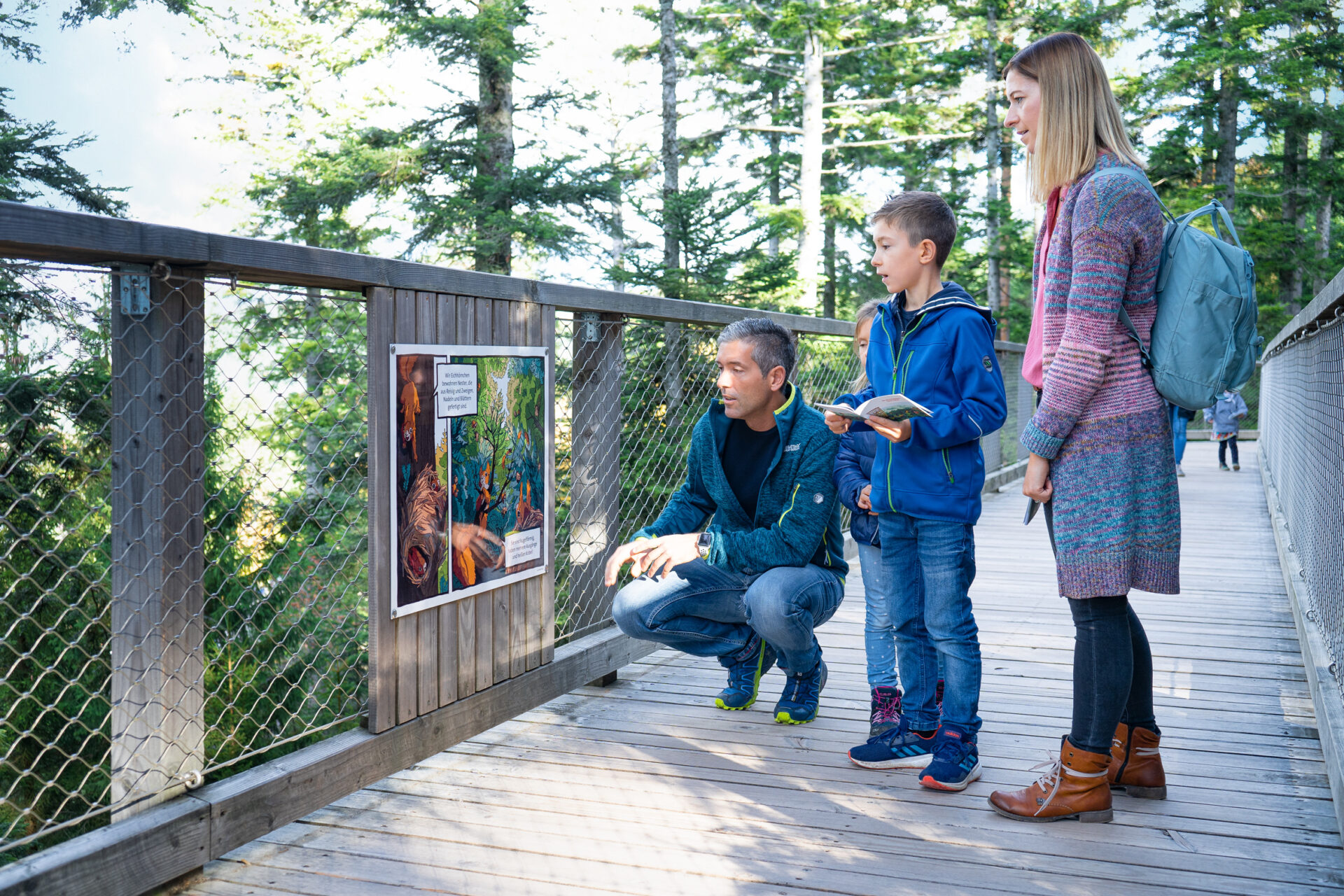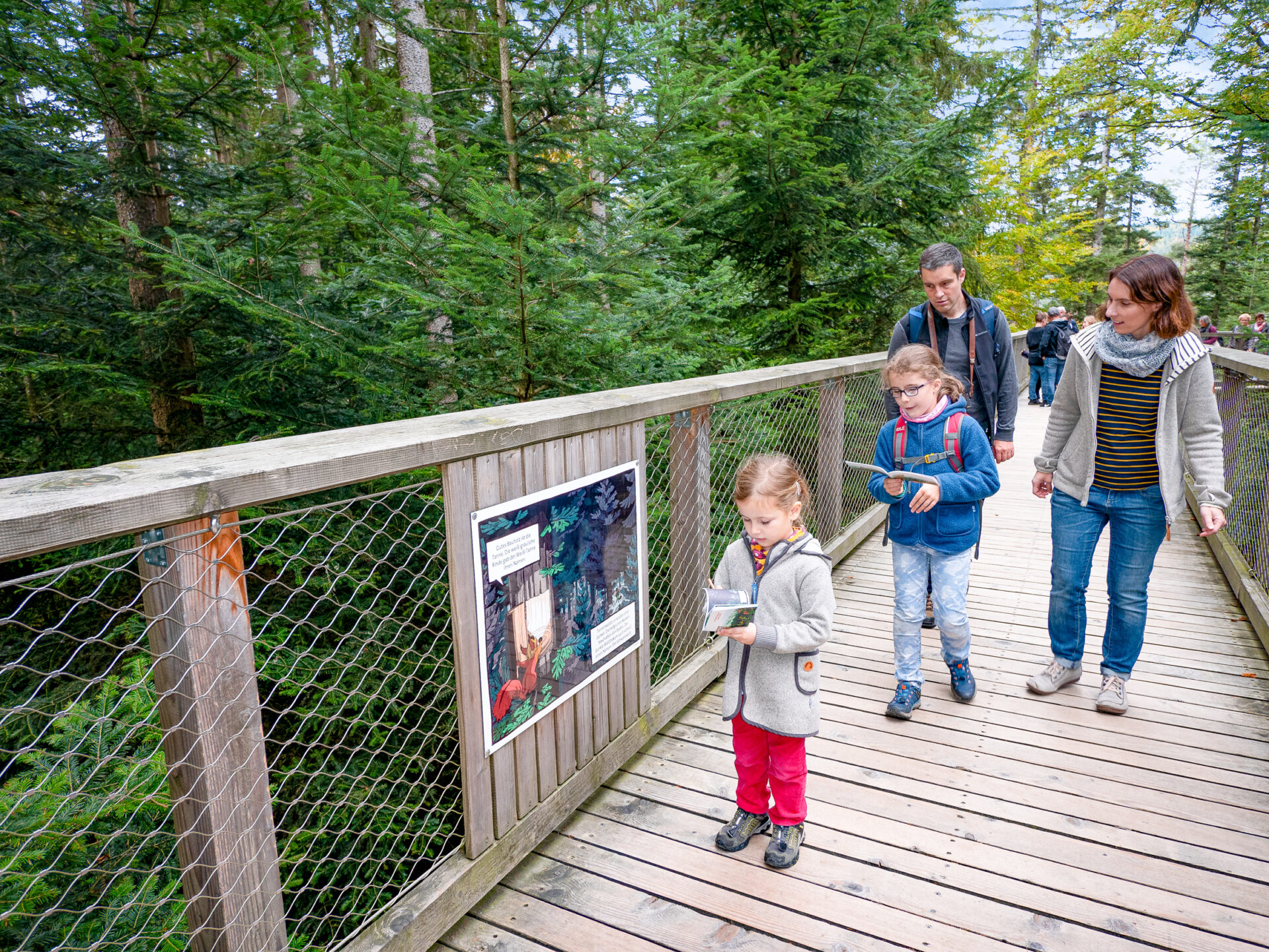 Die kleinen Besucher können mit Comic-Heft und Stift in der Hand spannende Fragen zu Natur und Landschaft beantworten. Auf den Comic-Tafeln entlang des Baumwipfelpfads helfen das Eichhörnchen und die Bewohner des Waldes die richtigen Antworten zu finden. Das Comic-Heft ist für eine Schutzgebühr von zwei Euro am Eingang zu bekommen. Wer alle Fragen beantwortet hat, bekommt am Ende des Ausflugs noch eine kleine Überraschung.