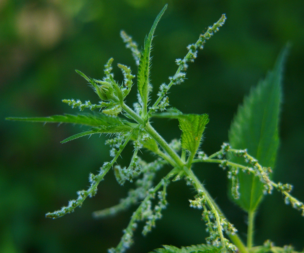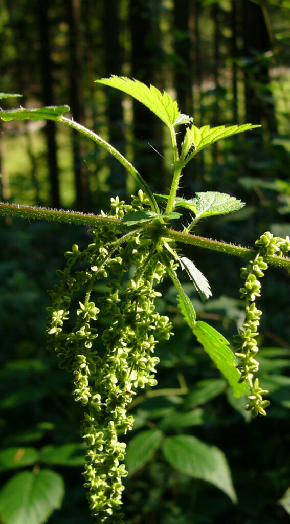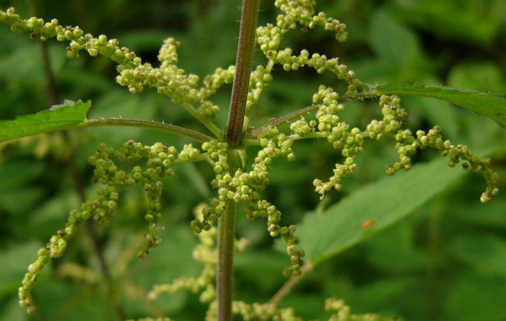 Die Große Brennnessel ist zweihäusig, das heißt es gibt männliche und weibliche Brennnesselpflanzen. Zur Ernte der Blätter und Triebspitzen spielt diese Tatsache keine Rolle und vor der Blüte könnt ihr den Unterschied auch nicht erkennen. Doch mit der Blüte ändert sich das. Wenn sie, je nach Höhenlage ab Juli oder August, zu blühen beginnt, dann zeigt sich der Unterschied deutlich. Die männlichen Brennnesselpflanzen haben abstehende Blütenrispen mit weißen kugeligen Blüten, die bei Reife ihre Pollen weit in die Luft schleudern.