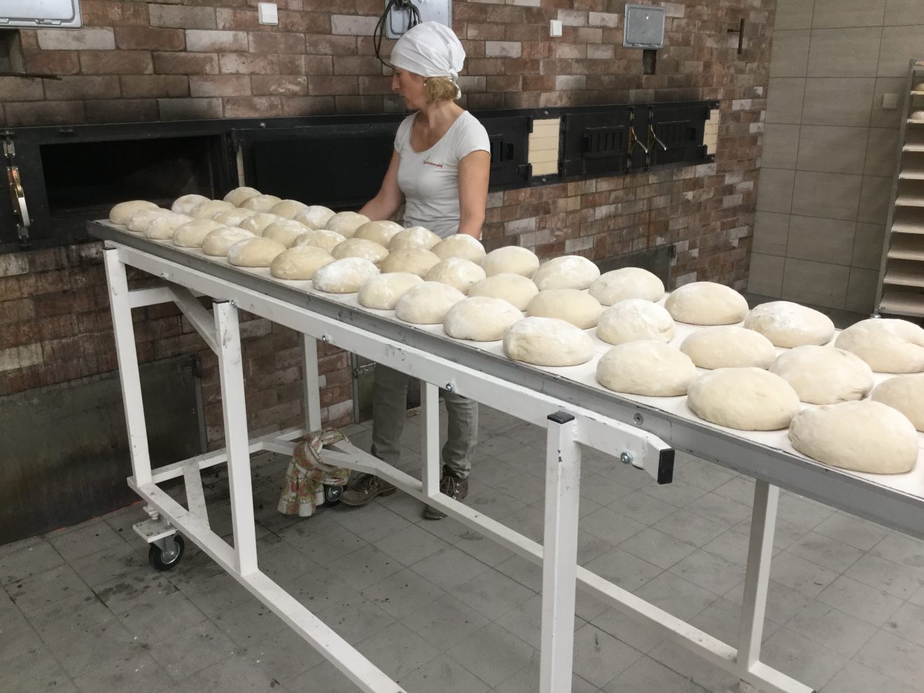 Das geht sehr fix, die große Routine der beiden macht sich bemerkbar. Der große tägliche Bedarf von bis zu 320 Broten – je nach saisonaler Schwankung – hat diese Maschinenunterstützung notwendig gemacht. Und schließlich müssen die Brote noch am Morgen früh genug fertig sein, um sie auszufahren, bevor die Marktscheune und die belieferten Hofläden öffnen.