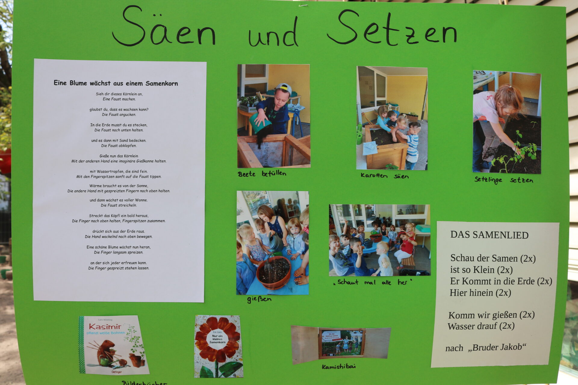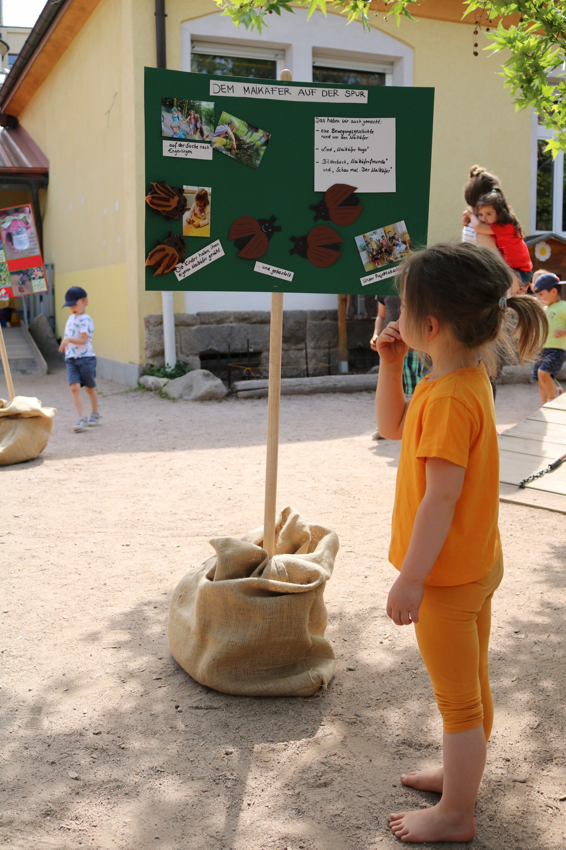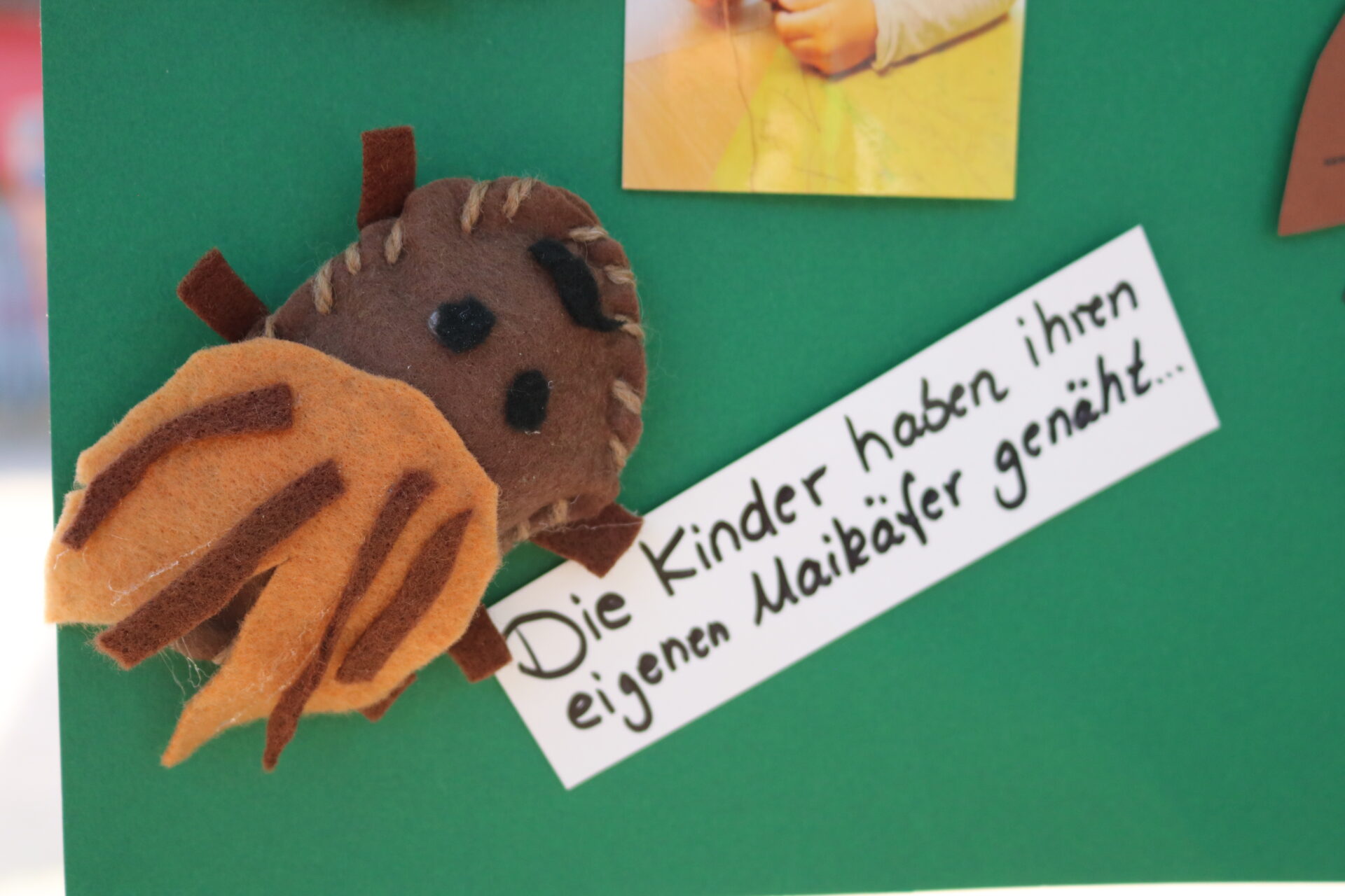 Im vergangenen Herbst kochten die Kinder Kürbissuppe und Apfelmus, nähten einen Kürbis, druckten Bilder mit einem Apfelstempel. Dazu gab es ein Kasperletheater. Ein Eichhörnchen konnten sie bei einem Spaziergang sogar dabei beobachten, wie es Nüsse vom Baum holte und knackte. Zum Maikäfer gab es ein Quiz. Außerdem durften die Kinder ihren eigenen Filzmaikäfer nähen. Sie lernten, wie Schmetterlinge entstehen. Bei den selbst gezüchteten Distelfaltern konnten sie das sogar in Echtzeit beobachten.