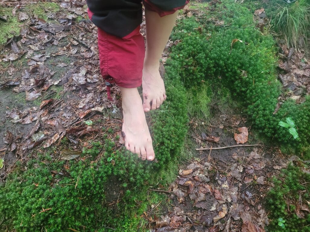 Wie kommen wir über den Bach? Über Steine mit Balancieren, oder einfach durch den Bach mit oder ohne Schuhe? Jetzt wurde es richtig aufregend. Aber alle haben es geschafft, mehr oder weniger nass. Barfuß im Wald oder mit Schuhen? Es durfte ausprobiert werden. Wie liegt es sich auf Waldboden, wie sehen Bäume von unten aus? Welche Schätze finden wir und finden wir den eben mit geschlossenen Augen getasteten Baum auch wieder?