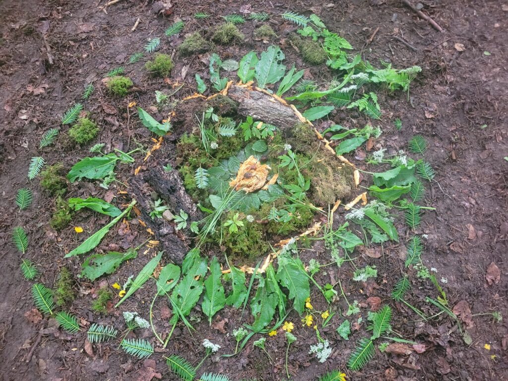 Viel zu schnell verging die Zeit. Mit Wildkräuterlimonade konnte noch der Geschmack des Naturparks getestet werden, damit die Zunge als Geschmacksorgan nicht zu kurz kam. Hier gab es Bewertungen von 10 möglichen – bis zu 0 Punkten. Über Geschmack lässt sich nun mal nicht streiten. Auf dem Rückweg suchten wir unterschiedliche Blattformen, verschiedene Gräser und Blüten, Steine, Äste und Rinde. Daraus entstanden kleine Kunstwerke als Erinnerung an diesen kleinen intensiven Ausflug in die Natur.
