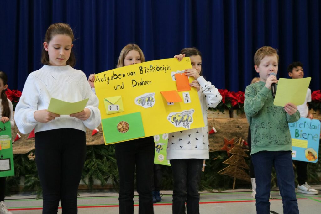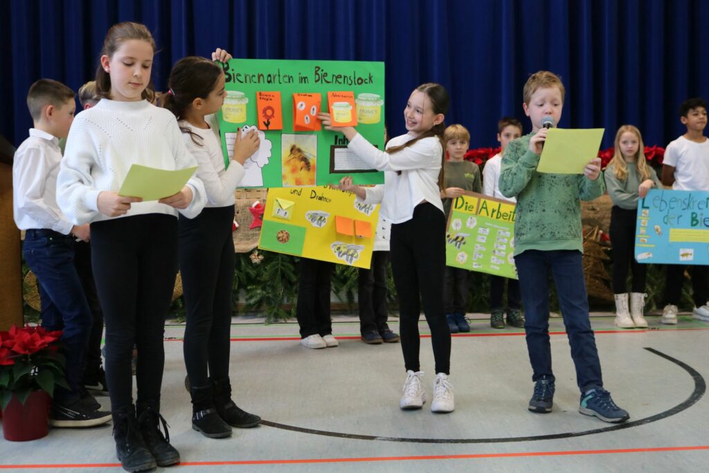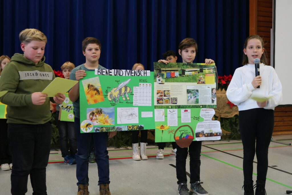Für die Erstklässlerinnen und -klässler ging es außerdem mit Kräuterpädagogin Andrea Heck auf Erkundungstour. Auf Wiesen in der Schulumgebung sammelten die Kinder heimische Wildkräuter, bestimmten sie und bereiteten ein Wiesenvesper zu: Es gab Kräuter- und Blütenbutter auf Vollkornbrötchen und dazu Holundersaft. . „Wir haben gelernt, dass man Wildkräuter auch essen kann und sie sogar lecker sind“, berichtet ein Schüler bei der Auszeichnungsfeier. „Am leckersten waren die Blütenblätter des Gänseblümchens“, ergänzt eine Mitschülerin.