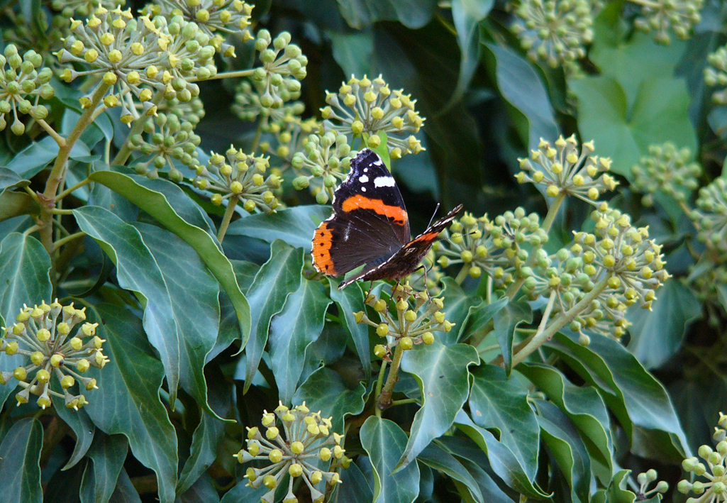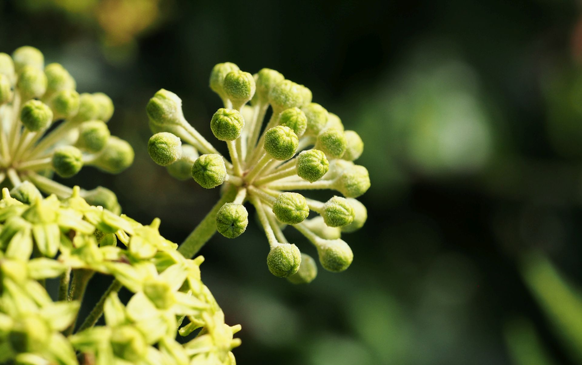 Nicht nur, dass uns seine immergrünen Blätter selbst im Winter unterm Schnee grün entgegenleuchten. Zu blühen beginnt der Efeu mit seiner gelblichen, kugeligen „Halbdolde“ gar erst ab September. Das ist gänzlich entgegen dem Rhythmus der Sonne, wenn andere Pflanzen in unseren Breiten ihren Rückzug vor dem Winter vollziehen. Für Bienen, Wespen und Schmetterlinge bietet er damit im Herbst eine wichtige, späte Nahrungsquelle. Und wenn ihr an einem sonnigen Herbsttag an einem blühenden Efeu vorbeikommt, könnt ihr es lautstark Brummen und Summen hören.