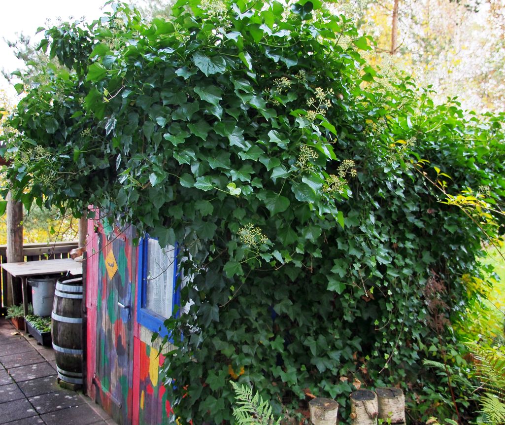 Inzwischen hat der Winter mit Minusgraden und den Schneefällen Einzug gehalten. Die bunten Blätter sind endgültig von den Laubbäumen gefallen und das vielgelobte „Grün“ der Natur ist, außer dem Tannengrün der Nadelwälder für diesen Winter verloren. Gäbe es da nicht noch die anderen Immergrünen, vorneweg den Efeu, der sich darüber hinaus auch noch ziemlich azyklisch verhält. Ganz und gar außergewöhnlich!