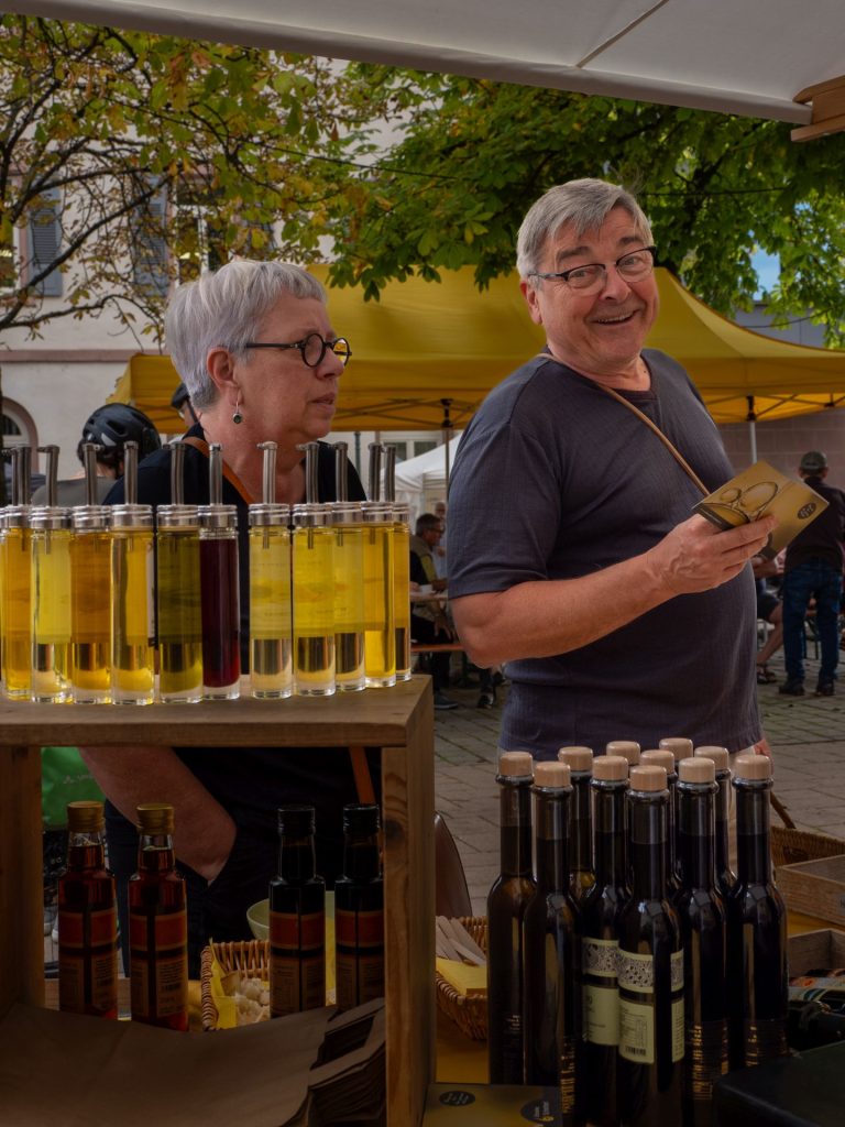 In seiner Eröffnungsrede sagte der Geschäftsführer des Naturparks Schwarzwald Mitte/Nord, Karl-Heinz Dunker, als Lead-Partner der Bio-Musterregion Mittelbaden+: „Bio ist ein Weg für unsere Landwirte, um sich auf die Zukunft einzustellen. Mit der Bio-Woche wollen wir die Menschen für regionales Bio begeistern.“ Das Konzept geht auf, wie Alexandra Heitz zeigt. Sie ist mit ihrem Mann und den beiden kleinen Kindern zum Bio-Markt nach Bühl gekommen. „Ich finde es schön, wie gesprächig die Beschicker sind. Man kann sich auf einer persönlichen Ebene unterhalten und erfährt, woher die Produkte kommen und wie sie hergestellt wurden“, sagt Heitz. Genauso nimmt es die Bio-Markt-Beschickerin Astrid Liebich vom gleichnamigen Weingut aus Sinzheim-Ebenung wahr: „Die Leute wollen ganz viel wissen und probieren. Ich freue mich wirklich, dass die Leute den Bio-Markt so gut annehmen.“