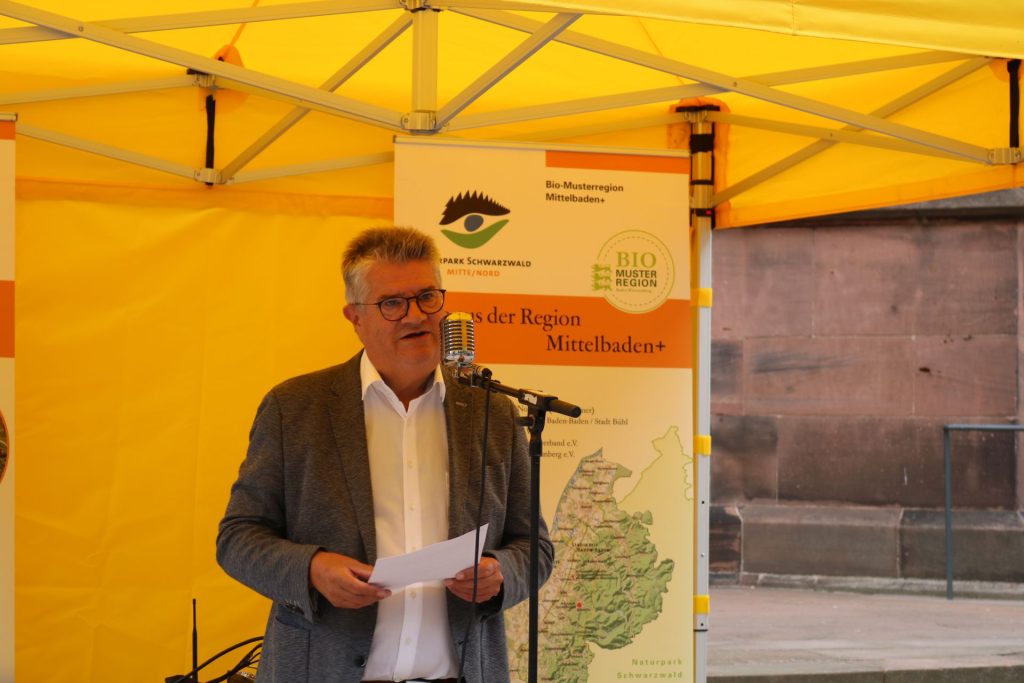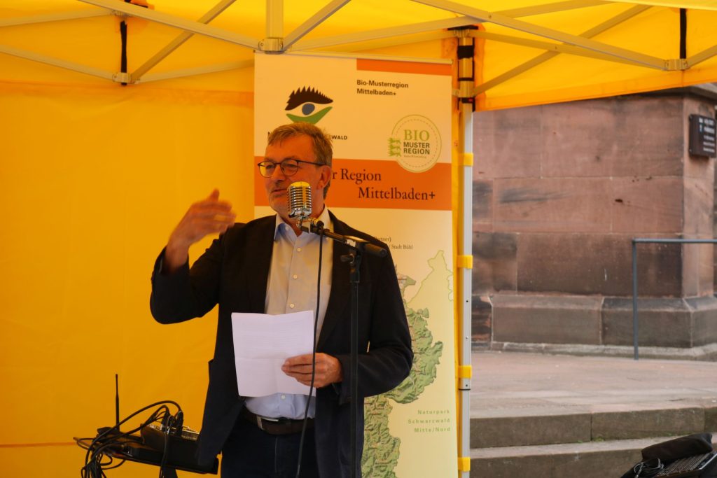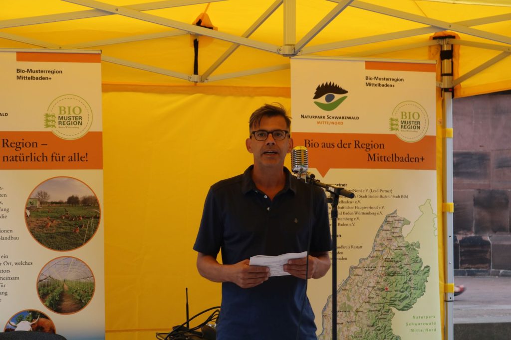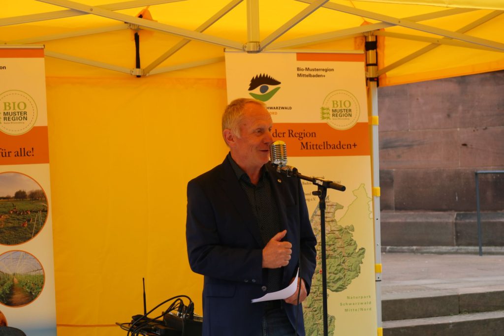 Für Bio begeistern will auch Bühls Oberbürgermeister Hubert Schnurr. In seiner Eröffnungsrede sagt er: „Bio birgt viel mehr als nur ein Siegel. Biologisch angebaute Produkte bedeuten gesunde Böden und gesunde Lebensmittel. Wer Bio kauft, unterstützt diese Ziele.“ Ebenfalls beim Auftakt der Bio-Woche dabei war der grüne Landtagsabgeordnete aus dem Wahlkreis Baden-Baden/Bühl, Hans-Peter Behrens. „Wir als Land Baden-Württemberg haben uns beim Klimaschutz hohe Ziele gesteckt. Der Bio-Markt und die Bio-Woche der Bio-Musterregion Mittelbaden+ zeigen die Chancen und Möglichkeiten des Bio-Anbaus in Mittelbaden auf“, führt Behrens aus. Dies betont auch Stefan Karcher vom Verein Bioregion Mittelbaden+ 2021 nochmals und richtet sich dann direkt an die Bio-Markt-Beschicker/innen: „Nachhaltige, ökologische Landwirtschaft trägt zum Klima- und Artenschutz bei. Ihr Bio-Beschicker lebt das jeden Tag!“