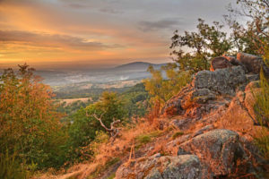 Wanderung auf die Lautenfelsen! Der Aufstieg, vor allem durch das Steintal, ist steiler, wird aber gemütlich angegangen. Oben angekommen, hoffen wir auf einen schönen Sonnenuntergang, wie hier 2017. Der Rückweg führt über breite Maschinenwege im Dunkeln.