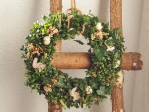 Mit etwas Moos, Heidelbeergrün, Knospen- und Flechtenzweigen sowie weiteren Naturmaterialien lässt sich auch für Anfänger mit etwas Geduld ein attraktiver Frühlings- oder Osterkranz herstellen. Gleiches gilt für ein Moosherz oder einen Osterhasen aus Weidenzweigen. Der grünen Fantasie sind ohnehin keine Grenzen gesetzt.