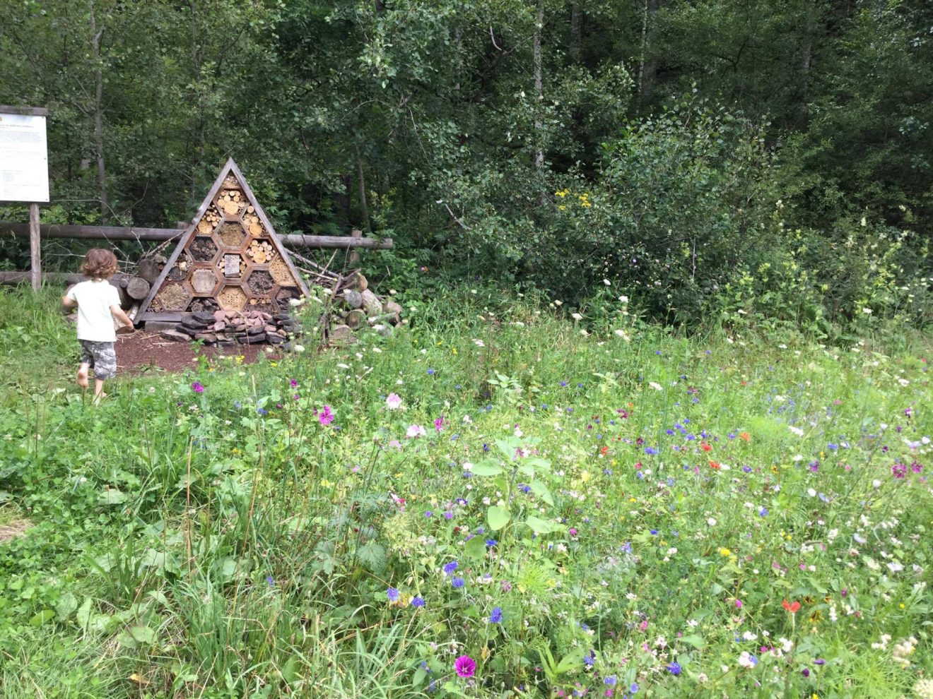 So wandern wir auf der 2,4 Kilometer langen Strecke weiter und freuen uns über die Natur, den Wald und die vielen liebevoll gestalteten Stationen. Die unterschiedlichsten Bodenbeläge sorgen für Abwechslung. Neben Kies, Holz und Lehm kann man sich auch durch abgerundete Glasscherben und Nagelköpfe tasten.