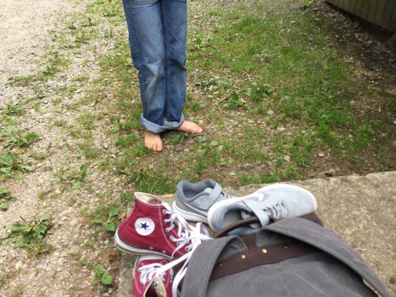 Die ersten Schritte ohne Fußbekleidung auf dem nass-kalten Waldboden sind so ungewohnt, dass wir froh sind, den nächsten grasbewachsenen Streckenabschnitt erreicht zu haben. Doch als die ersten 200 Meter geschafft sind, laufen wir barfuß, als täten wir nie was anderes.
