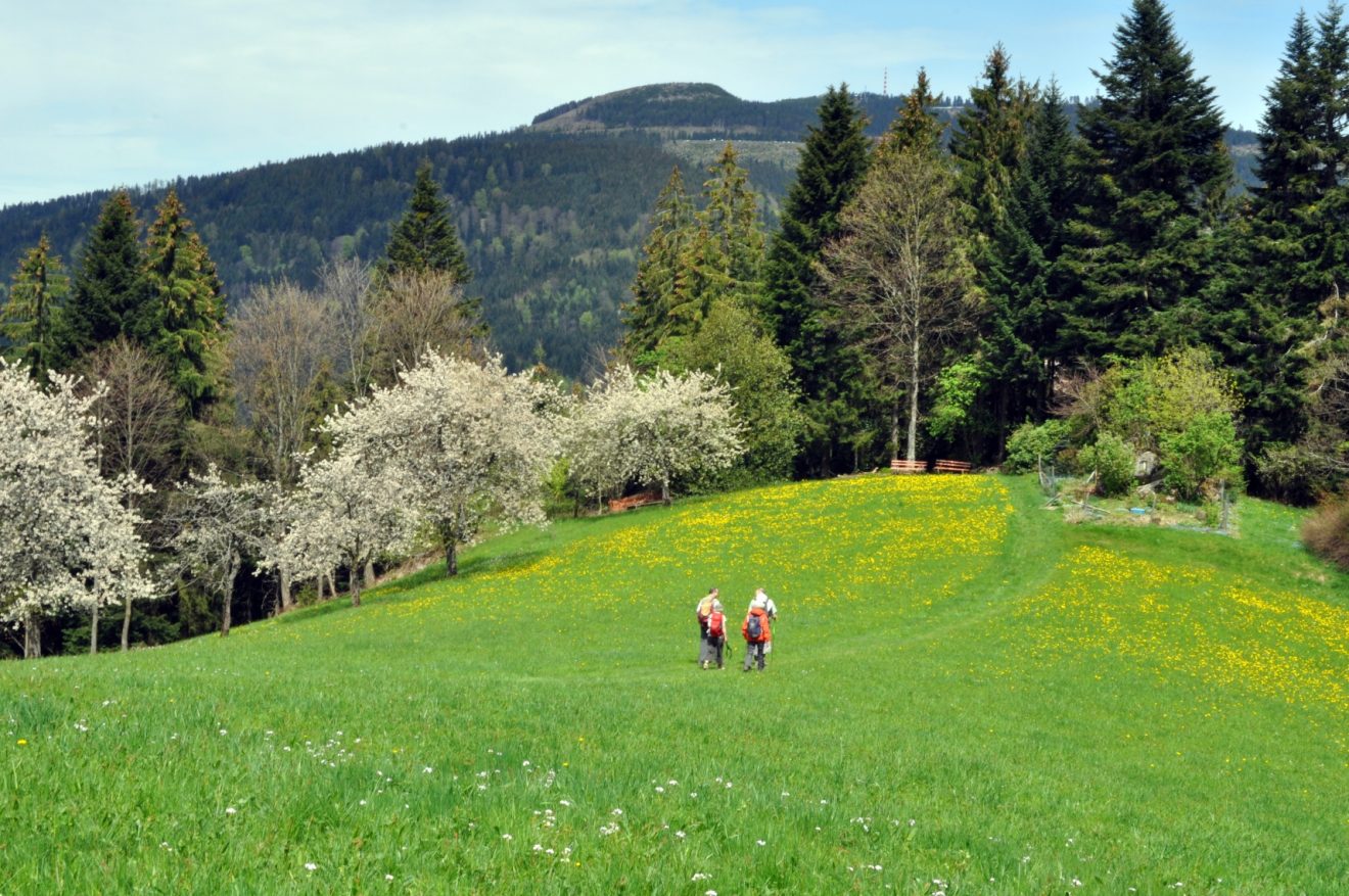 Und auch wenn der Schwarzwald im Naturpark heute anders aussieht als in früheren Jahrhunderten – schön ist er in jedem Fall! Auf unserem aktuellen Tourentipp für euch, dem Holzsäger-Rundweg, könnt ihr nicht nur die wunderbare Landschaft und die Waldatmosphäre genießen, sondern kommt auch an einigen alteingesessenen, traditionellen Sägewerken vorbei. Los geht’s an der Mummelseehalle in Seebach. Dort gibt es einen kostenlosen Parkplatz. Seebach ist aber auch sehr gut mit öffentlichen Verkehrsmitteln zu erreichen. Die Rundwanderung – Kategorie leicht – führt zunächst an der Herz-Jesu-Kirche im Ortskern vorbei und über die Hauptstraße weiter auf der Kirchberger Straße durch das Baugebiet „Kirchberg“. Danach geht es leicht bergauf und wir erreichen, oberhalb des Haasenhofs und über die „Seebacher Winterseite“, Hinterseebach.