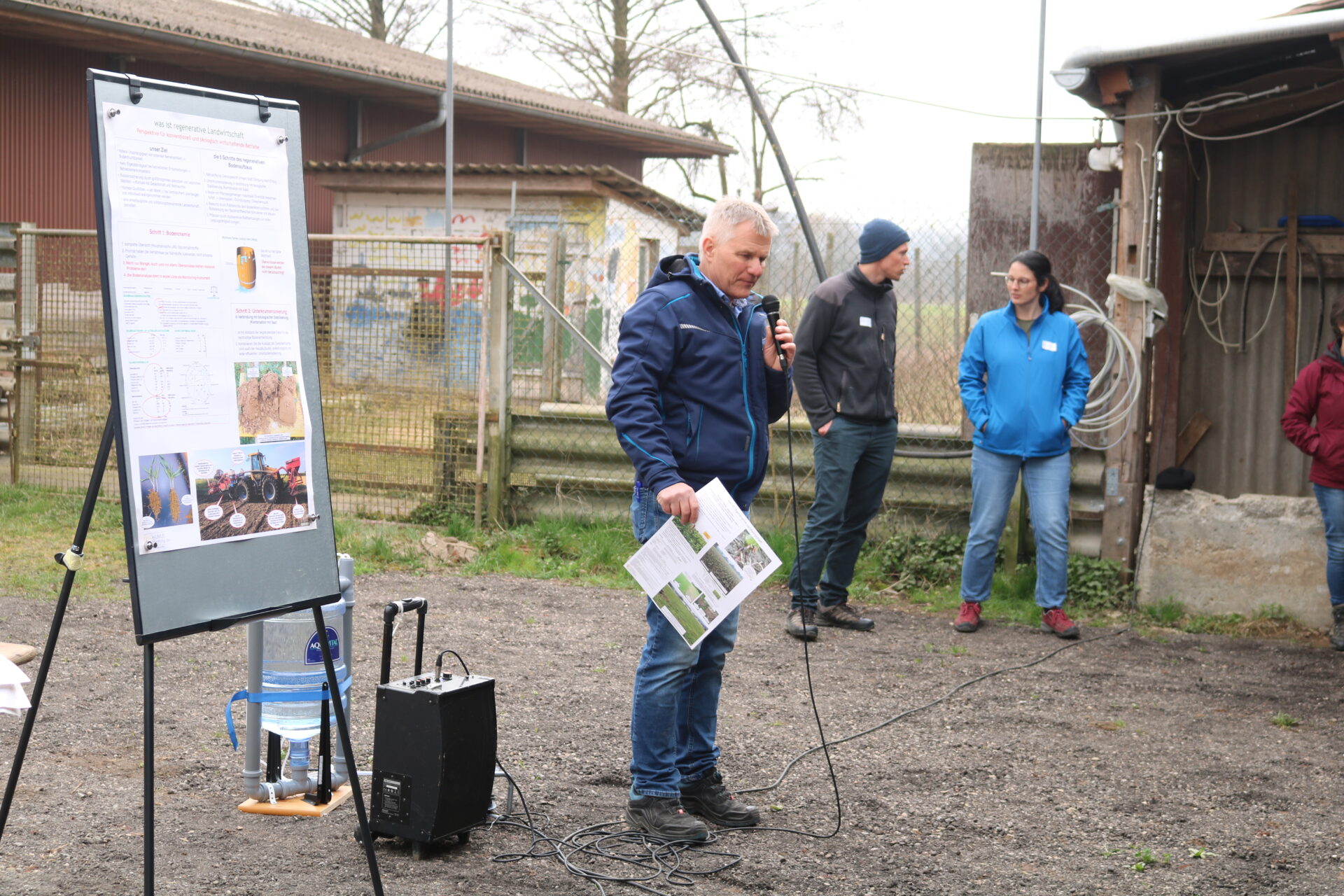 Auf der Veranstaltung informierte Boden- und Pflanzenexperte Friedrich Wenz, Gesellschafter des gemeinwohl-orientierten Unternehmens Positerra, die Gäste über regenerative Landwirtschaft und humusfördernde Bewirtschaftung. Die Erhöhung des organischen Anteils fördert das Bodenleben und Nährstoffe können besser gebunden werden. Die Böden werden zudem fruchtbarer, können mehr Wasser speichern und werden widerstandsfähiger gegen die Folgen des Klimawandels. „Wir möchten eine Landwirtschaft fördern, die ‚enkeltauglich‘ ist“, erklärte Wenz. Huschle stellte seinen Betrieb vor und berichtet über seine Erfahrungen mit der regenerativen Praxis, mit der er gute Ergebnisse erziele.