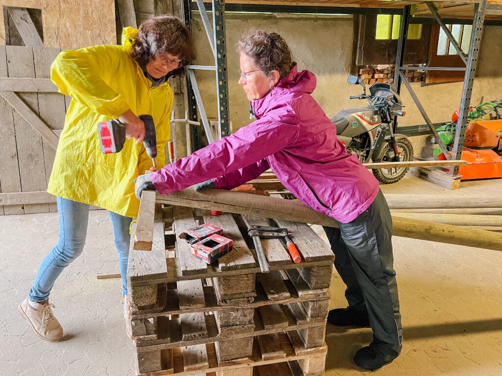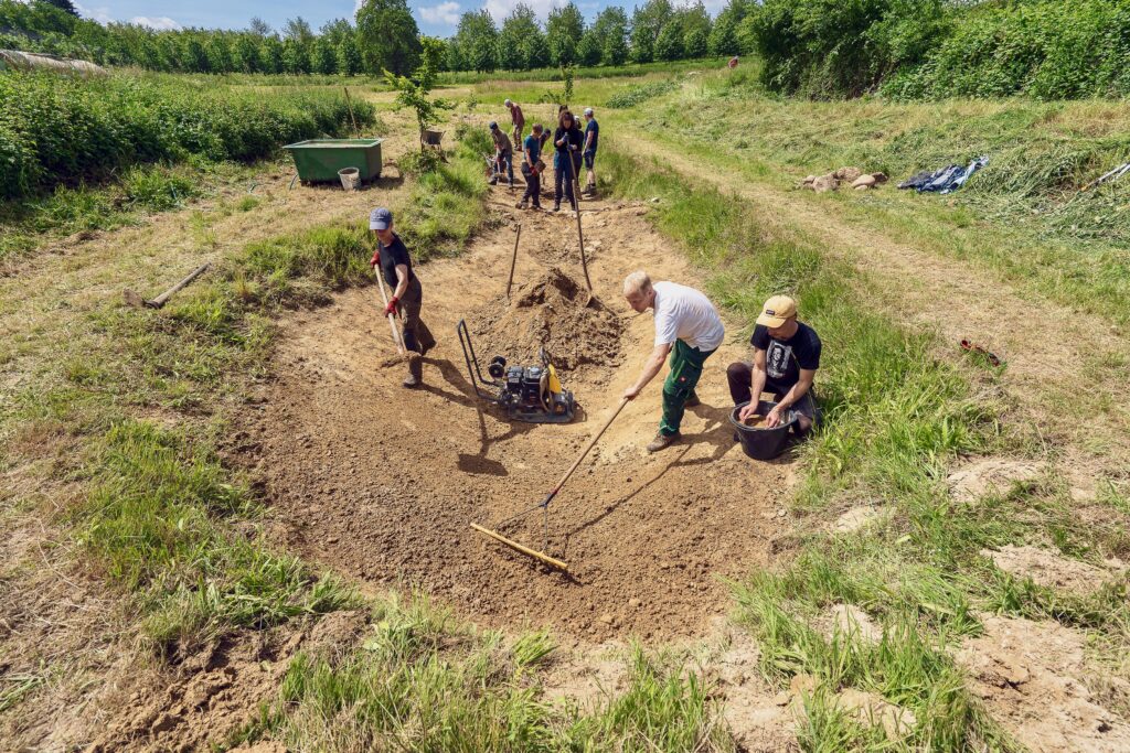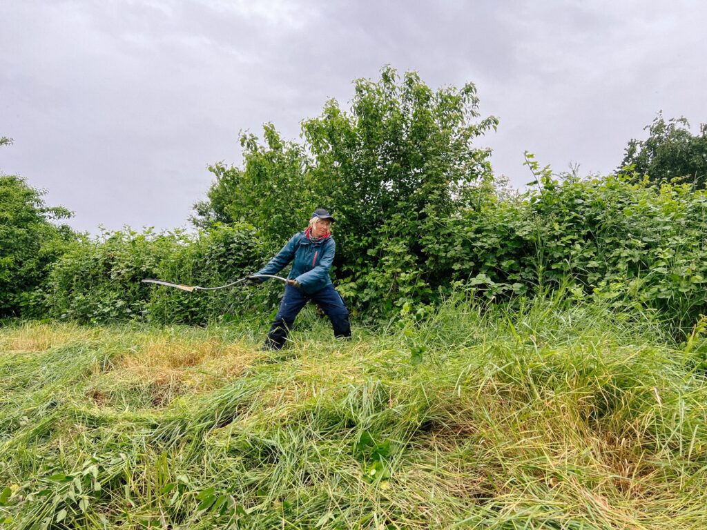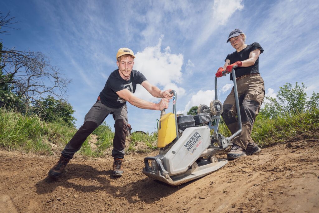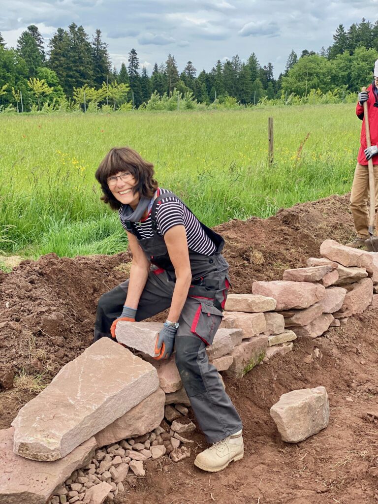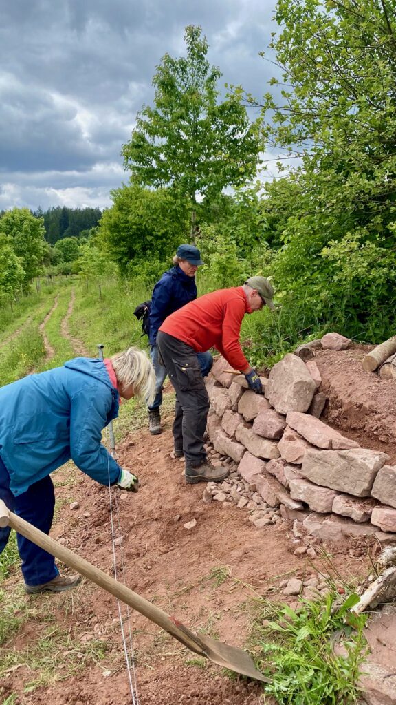 Für die tatkräftige Unterstützung der Bergwaldprojekt-Freiwilligen ist Landwirt Johannes Lorenz von der Lorenz.Farm in Achern-Fautenbach sehr dankbar. Denn mit der Hilfe der rund 20 Freiwilligen am 28. und 29. Mai konnte er Arbeiten angehen, für die er als Nebenerwerbs-Landwirt im Alltag nur selten Zeit findet: einen Teich nachverdichten, ein Mauswieselhabitat anlegen, Ansitzstangen für Greifvögel bauen und bei den Beeren- und Kräuterbeeten aufstellen, Nützlingsverstecke anlegen sowie Vorbereitungen für die Anlage des mit dem Naturpark Schwarzwald Mitte/Nord geplanten Agroforstsystems treffen.