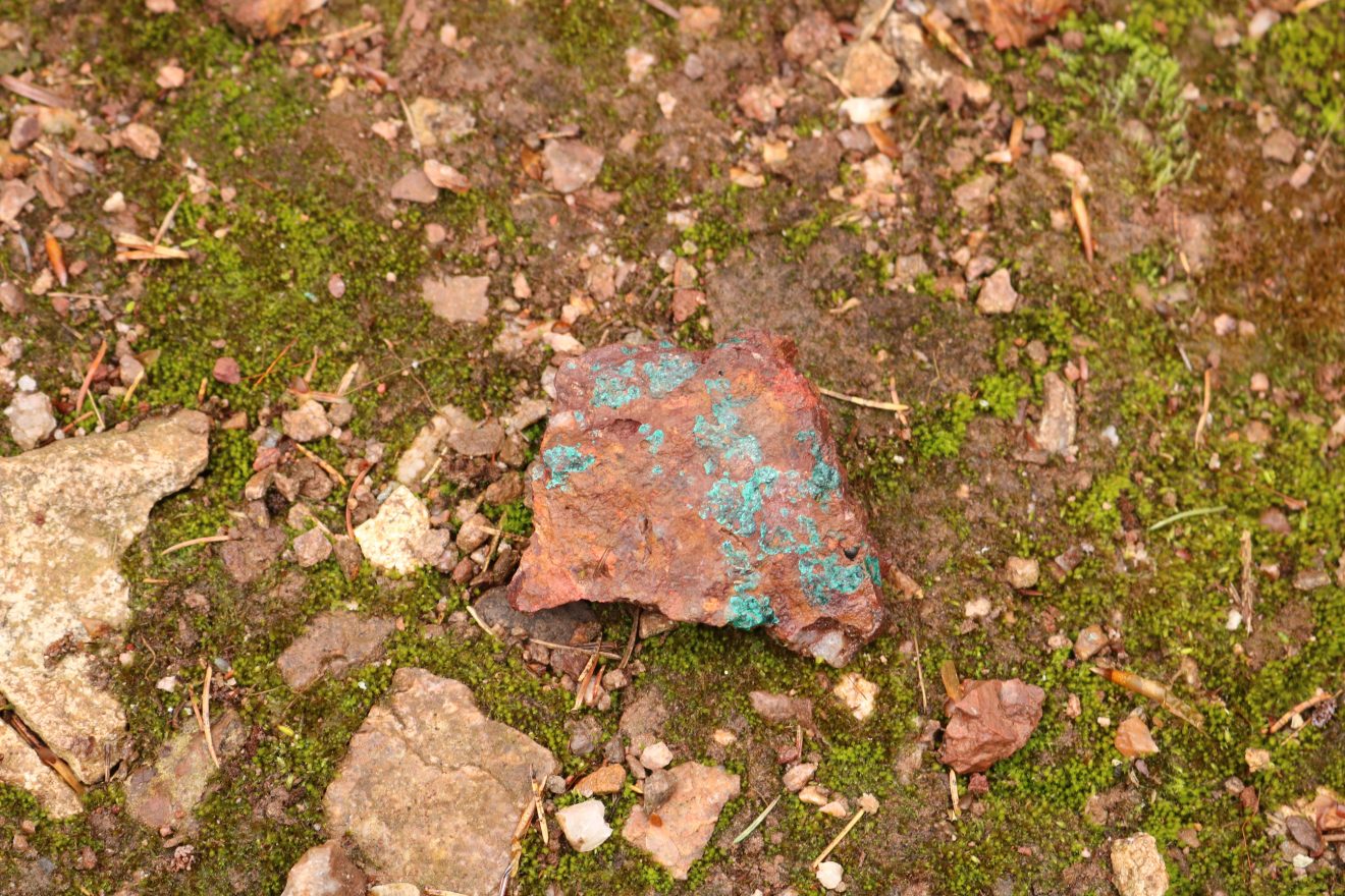 Eine der nächsten Stationen ist eine historische Bergbauhalde, ein Relikt der Grube Silberbrünnle, wo mindestens seit dem 16. Jahrhundert wahrscheinlich Blei-, Silber- und Kupfer-, aber auch manganreiche Eisenerze gesucht wurden. Die Gruppe findet viele unterschiedliche Steine, beispielsweise Quarzkristall, Kupfermineralien wie Malachit und Pseudomalachit oder eben Eisen- und Manganerze.