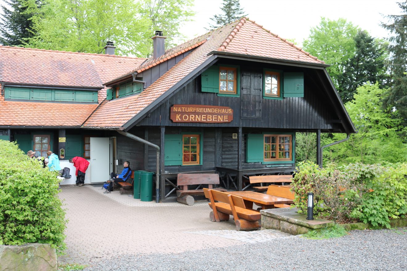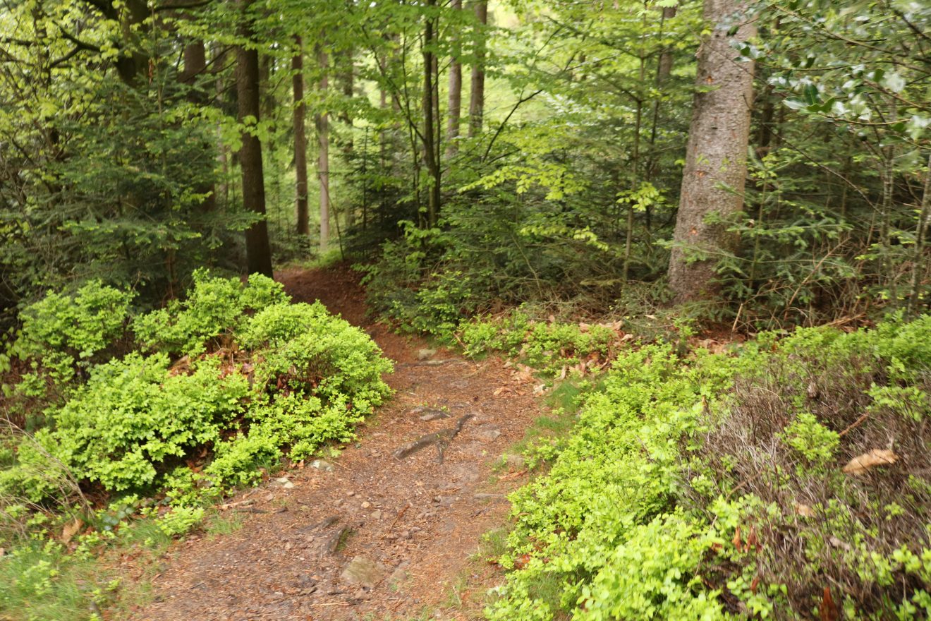 Nach einer Rast im bewirtschafteten Naturfreundehaus beginnt der Abstieg. Linkerhand macht Megerle auf den Tulpenbaum und den Mammutbaum aufmerksam, die hier nicht mehr heimisch sind – aber waren. Sie sind vor 2,5 Millionen Jahren im Schwarzwald ausgestorben. Nun teilt sich der Weg: Der bequeme Waldweg führt barrierefrei wieder hinab zum Parkplatz. Ein schmaler, spannenderer Pfad führt von diesem Waldweg rechts ab zu einem Arboretum. Doch kurz davor wenden sich die Wanderer links und folgen einer Pfadrinne. Hier sind viele Sandsteine aus der Buntsandstein-Formation zu finden, die vom Regenwasser heruntergespült werden. Plötzlich liegen sehr viele helle Steine auf dem Pfad. Es handelt sich wieder um Rhyolite aus dem Perm, die Halden bilden. Hier fühlen sich Reptilien wie die harmlose Schlingnatter wohl.