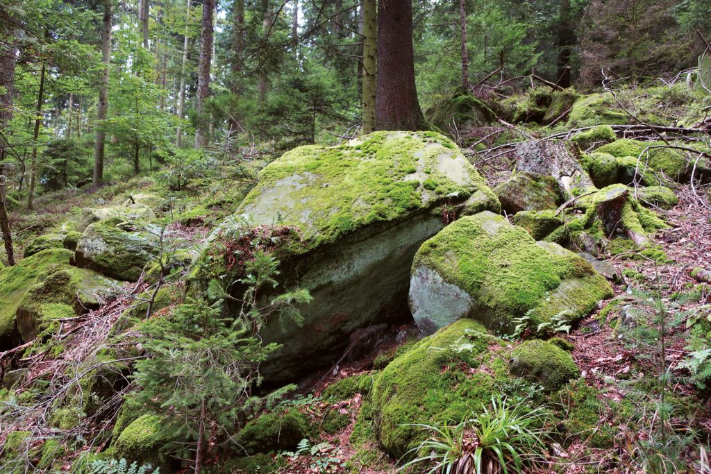 Weiter geht es nicht über einen der ausgeschilderten Wanderwege, sondern über den leicht bergab führenden „Christesweg“ mit Schranke. Nach rund 150 Metern sind große Gesteinsblöcke rechts am Weg zu erkennen. Auch hier handelt es sich um Badischen Bausandstein. Am Ende der letzten Kaltzeit taute der Permafrost-Boden auf und die Erd- und Gesteinsmassen an den Hängen kamen ins Rutschen. Die größere Blöcke haben sich hier angehäuft. Viele der Steinblöcke sind bewachsen mit spezialiserten Pflanzen, beispielsweise die Farnart „Engelsüß“ und viele Moosarten. Sie zeigen einen sauren untergrund an. Auf dem Waldboden würden sie von anderen Pflanzen wie Sträucher und Bäume verdrängt, die wiederum nicht auf Felsblöcken wachsen können.
