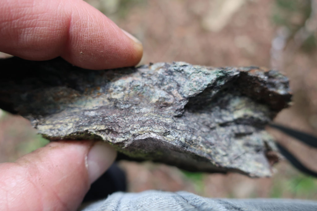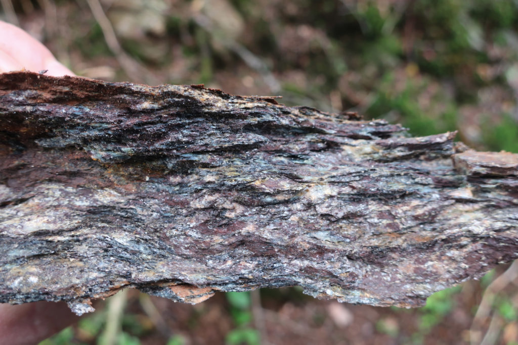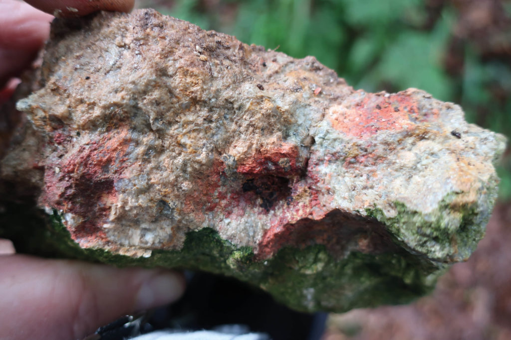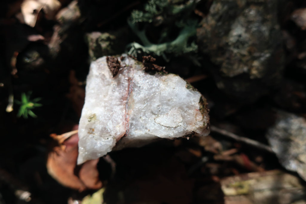 Der Kleine Waldweg mündet in einen breiten Fahrweg. Dort rechts abbiegen. Gleich an der Abbiegung ist Ortho-Gneis zu sehen, der teilweise von Quarzgängen durchzogen ist. Vereinzelt sind Brocken it rosa und weißem Schwerspat zu finden, die man schon allein an ihrem hohen Gewicht erkennen. In ihren Klüften finden sich teilweise unke Eisen- und Manganineralisierungen. Hier verläuft also ein Mineraliengang.
