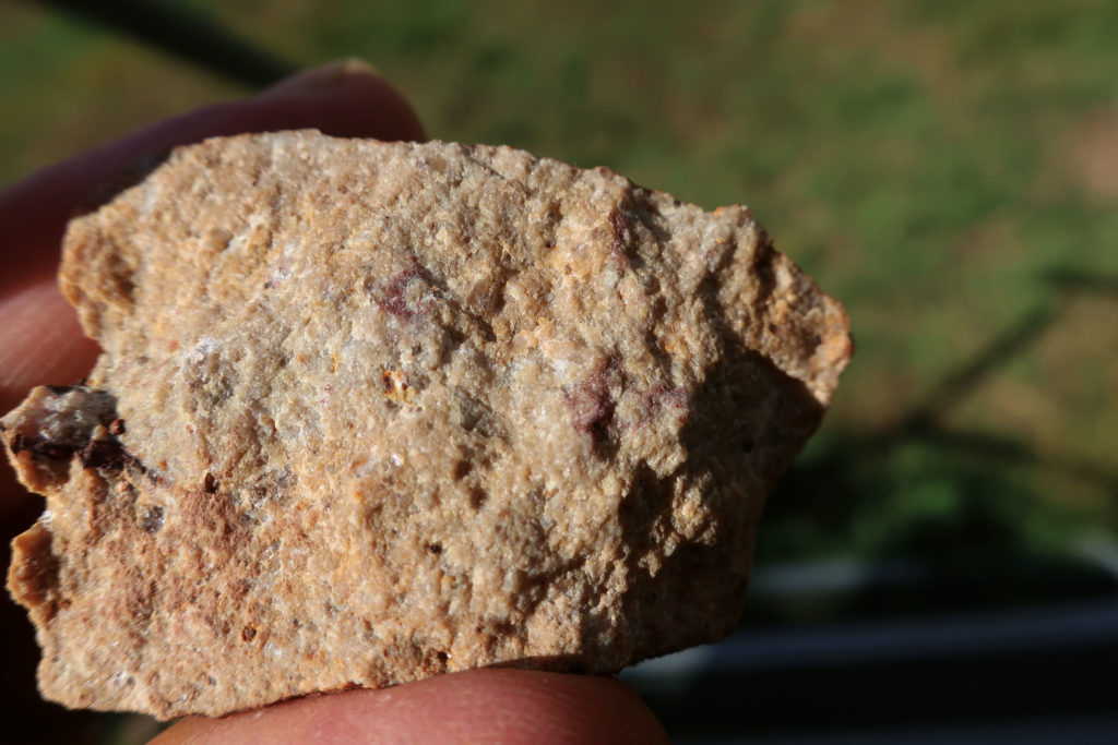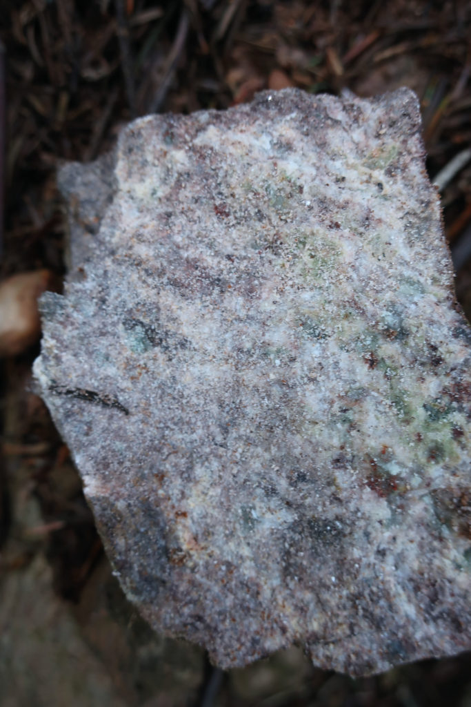 Geht weiter bis zu vorspringenen Felsen rehts und Halden links vom Weg. Hier finden sich milchig-weiße und fettglänzende Gang-Quarze, aber auch vor allem ein graugelbliches, ungebändertes, sehr hartes und feinkörniges Gestein mit kleinen Kristallsprengseln: Granophyr. Zum Teil weisen die
