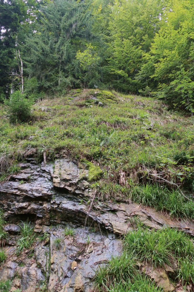 Weiter unten am Weg erscheint rechts ein Aufschluss in der Böschung, also ein „Fenster in die Erdgeschichte. Dort finden sich Brocken von Para-Gneis, erkennbar an den langen Bänderungen. Nach 100 Meten biegt ihr scharf rechts auf einen grasige Waldweg ab und folgt ihm bergab rund 200 Meter. Dort entspringt eine Quelle in der Böschung. Darauf deuten auch Zeigerpflanzen wie die Steifblättrige Knäuel-Binse oder das Wechselblättrige Milzkraut hin. Quellen haben eine wichtige Funktion als Lebensraum für viele Pflanzen und Tiere wie Amphibien. 50 Meter weiter findet ihr schon die nächste Quelle. Der Weg führt fast genau an einem Quellhorizont entlang, der die Grenze zwischen dem kristallinen Grundgebirge (hier Para-Gneis) und dem Deckgebirge (Sandsteinschichten des Buntsandsteins) markiert: Das Wasser sickert durch den relativ wasserdurchlässigen Sandstein, bis es auf die relativ dichten und daher wasserundurchlässigen Kristallin-Gesteine trifft. An diesen fließt das Wasser entlang, bis es, wie hier, an Hängen als Quelle zutage tritt.