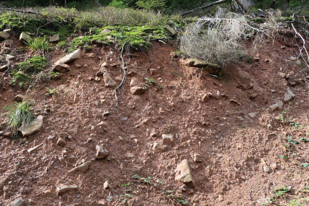 Folgt dem Fahrweg bis zu einer letzten Linkskurve. Rund 200 Meter vor einer am Ende eines Aufschlusses sichtbar werdenden Hütte seht ihr unter anderem rötlich gefärbte Fließerden und einzelne Wanderblöcke der roten Sandsteine. Da manche Gesteinsblöcke mehrere Hundert Meter Rutschungsstrecke hinter sich haben, wurden ihre Kanten zum Teil abgeschliffen. Im Aufschluss rechts an der Wegeböschung wittert ein hartes, ungebändertes kristallines Gestein heraus. Zum dritten Mal begegnet ihr dem Granophyr-Gang.