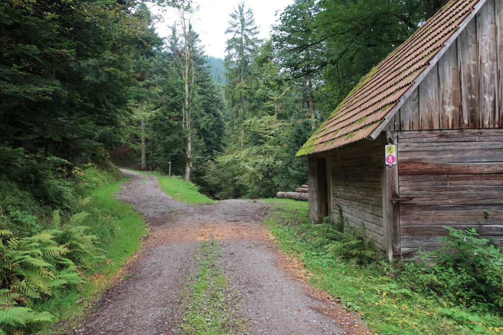 Geht weiter bis zu der Hütte. Sie ist offen und ihr könnt sie als Rastplatz oder Schutzhütte nutzen. Bitte nach dem Verlassen die Türe wieder schließen! An ihrer Längsseite gibt es einen Futtertrog, der zur Fütterung von Rückepferden diente. Ihr Fundament besteht aus schön behauenem Badischen Bausandstein. Ein Stück weiter rechts am Weg entdeckt ihr einen Baumstammbrunnen. Auf eigene Verantwortung könnt ihr das natürliche, aber nicht kontrollierte Quellwasser trinken. Da es in Buntsandsteinschichten mineralisiert wurde, handelt es sich um echtes „Wüstenwasser“. Geht den Fahrweg wieder zurück und folgt links an der Hütte vorbei der linken Wegegaben auf dem „Kaltbrunnenweg“.