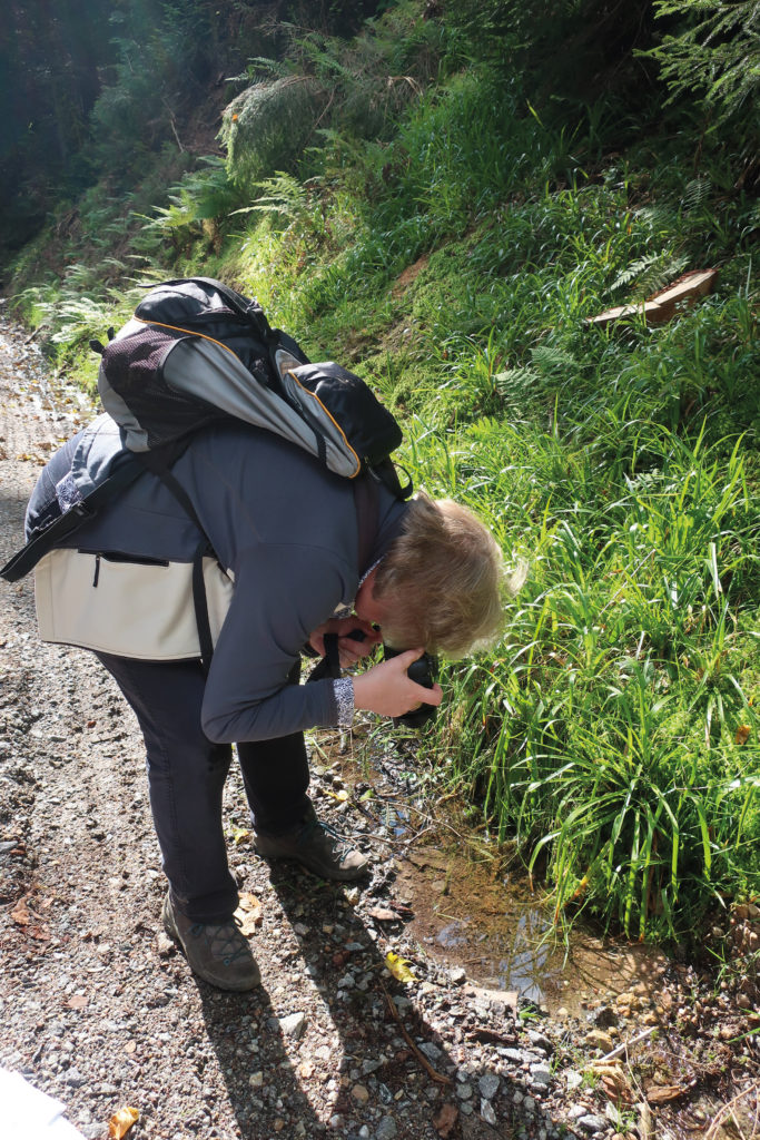 Bis in den Herbst hinein sind im Wasser die Larven des Bergmolchs zu beobachten, wenn auch nicht leicht zu entdecken. Die erwachsenen Tiere sind am ehesten im Frühjahr zu sehen. Links oben auf der Wegeböschung befinden sich große Gesteinsblöcke. Mit ein wenig Suchen entdeckt ihr den „Schweizer-Käse-Stein“, einen Felsblock mit kreisrunden Löchern, als ob sie von Menschenhand hineingebohrt worden seien. Doch weit gefehlt. Die Löcher rühren von Kugeln her, krustigne Gebilden mit einem hohen Eisen-, Mangan- und Tonanteil, Reste früherer Krustenböden in der Buntsandstein-Wüste. Irgendwann wurden sie vom Wasser mitgerissen, dabei zu Kugeln geformt und im „normalen“ Wüstensand eingebettet, der später zum Buntsandstein wurde. Da die Kugeln anders beschaffen sind als der sie umgebende Sandstein, wittern sie leicht heraus, oft sogar als ganze Kugeln. Zurück bleiben kreisrunde Löcher. Fertig ist der „Kugelsandstein“ genannte „Schweizer-Käse-Stein“.