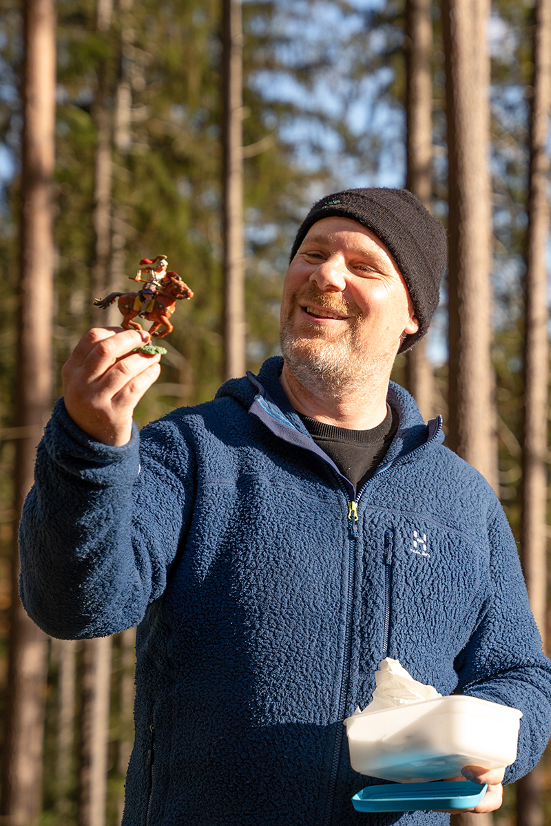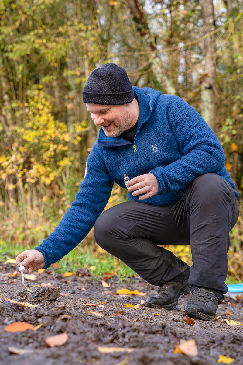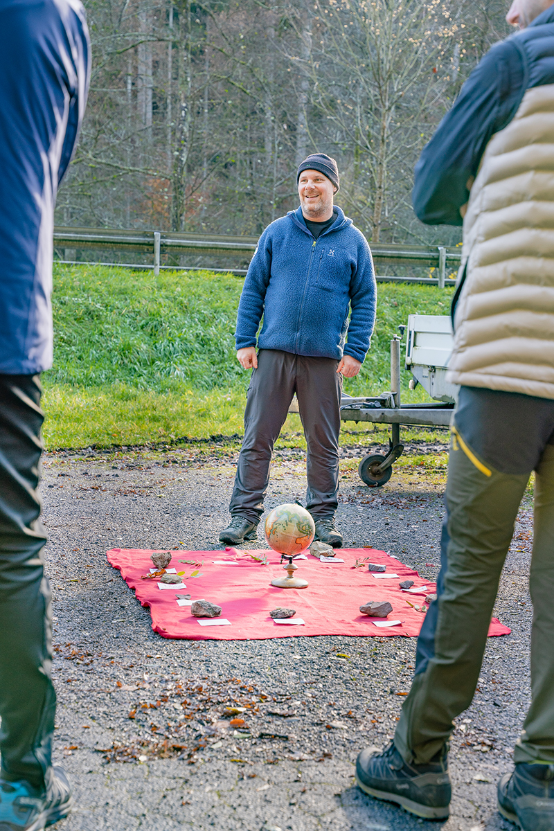 „Jede Gruppe ist ein bisschen anders. Da gehe ich ganz intuitiv auf die Fragen ein, die meine Gäste am meisten beschäftigen“, so Stotz. „Geologie ist dabei ein wunderbarer Einstieg, um auf andere Themen überzuleiten“. Dass das stimmt, erfuhr die Gruppe, als Stotz eine Spielfigur eines Römers zeigte, die zuerst einmal etwas Ratlosigkeit hervorrief. Als Stotz anschließend eine römische Münze aus der Zeit Kaiser Diokletians herumgehen ließ, die einst sein Vater nahe des auf der anderen Talseite gelegenen Rudersbergs gefunden hatte, erklärte sich der Zusammenhang. Etwas weiter den Weg entlang verriet er dann: „Hier beginnt jetzt der Totholzpfad“. Diesen Namen hat Stotz diesem Stück des Weges gegeben, um seine Gäste zu sensibilisieren, was sie dort erwartet. „Es ist faszinierend, wie die Natur Recycling betreibt. Wir Menschen können uns davon viel abschauen“, erklärte er und führte in einem kleinen Experiment vor, wie Pilze das Totholz in seine Ausgangsstoffe zerlegen und sie so in den natürlichen Kreislauf zurückführen.