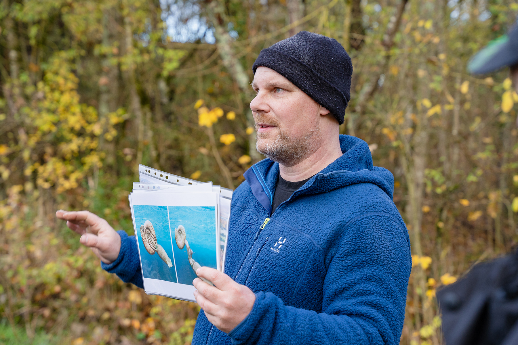 Als die Gruppe die Hälfte der Strecke zurückgelegt hatte, stoppte Stotz abrupt und zog mit der Hand eine imaginäre Linie in die Luft. „Hier befinden wir uns ziemlich genau an der Grenze zwischen Schwarzwald und Heckengäu“ erklärte Stotz. Um das zu verdeutlichen, hob er zwei Steine auf, die sich auf den ersten Blick ähnlich sahen. Erst die Probe mit einem Tropfen Salzsäure zeigte, dass es sich bei dem einen Stein um einen Kalkstein handeln musste, während der andere, der nicht auf die Salzsäure reagierte, sich als Bundsandstein entpuppte. „Auf dieser Seite“, erklärte der Schwarzwald-Guide, während er in Richtung des Calwer Stadtteils Stammheim zeigte, „befand sich einst das Muschelkalkmeer“. Zur Verdeutlichung, wer denn dieses Meer einst besiedelte, reichte er einige Versteinerungen herum. „Ammoniten und Belemniten“, erklärte Stotz und fügte hinzu: „Die Überreste dieser und anderer Schalentiere sind der Grundstoff für den hier vorherrschenden Muschelkalk“.