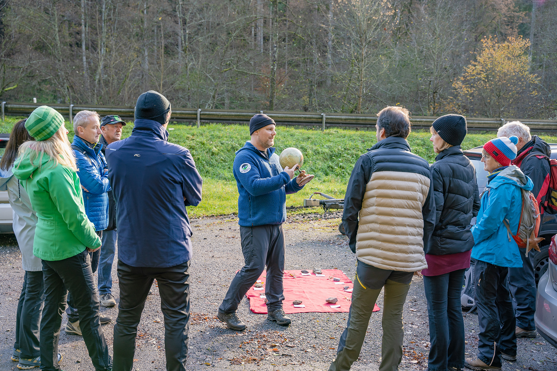 Die Gruppe um Nicolai Stotz startete am Parkplatz im Öländerle, einer kleinen Siedlung am Ufer des Flusses Nagold. Hier hatte Stotz für die ankommenden Gäste bereits einen Steinkreis aufgebaut, anhand dessen er die Geologie im nördlichen Schwarzwald erklärte. „Dieser Tonschiefer aus dem Traischbachtal bei Gaggenau ist sage und schreibe 500 Millionen Jahre alt“ erklärte Stotz und reichte das Stück Gestein herum, wobei er meinte: „Man muss zugeben, dass dieser Stein einem eine gewisse Ehrfurcht abverlangt.“
