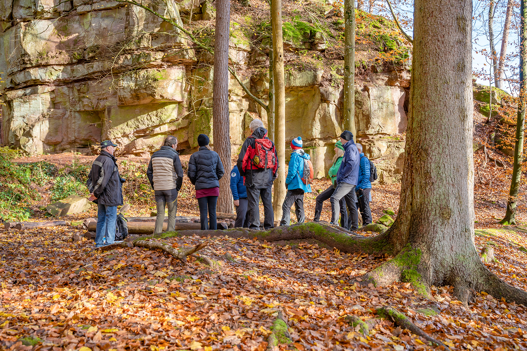 Natürlich darf bei einer GeoTour die Geologie nicht zu kurz kommen. So fanden sich die Gäste nach einem kleinen Anstieg inmitten einer steinernen Arena aus haushohen Felsen wieder. Ein alter Buntsandsteinbruch gab aufschlussreiche Einblicke, wie es hier vielerorts unter der Erde aussieht. „Als diese Steine entstanden, war der Nordschwarzwald eine Wüste, ähnlich der Sahara“, erläuterte Stotz. Über die Jahrmillionen verdichtete sich der Wüstensand immer mehr, bis er schließlich zu Stein wurde. „Das ist
