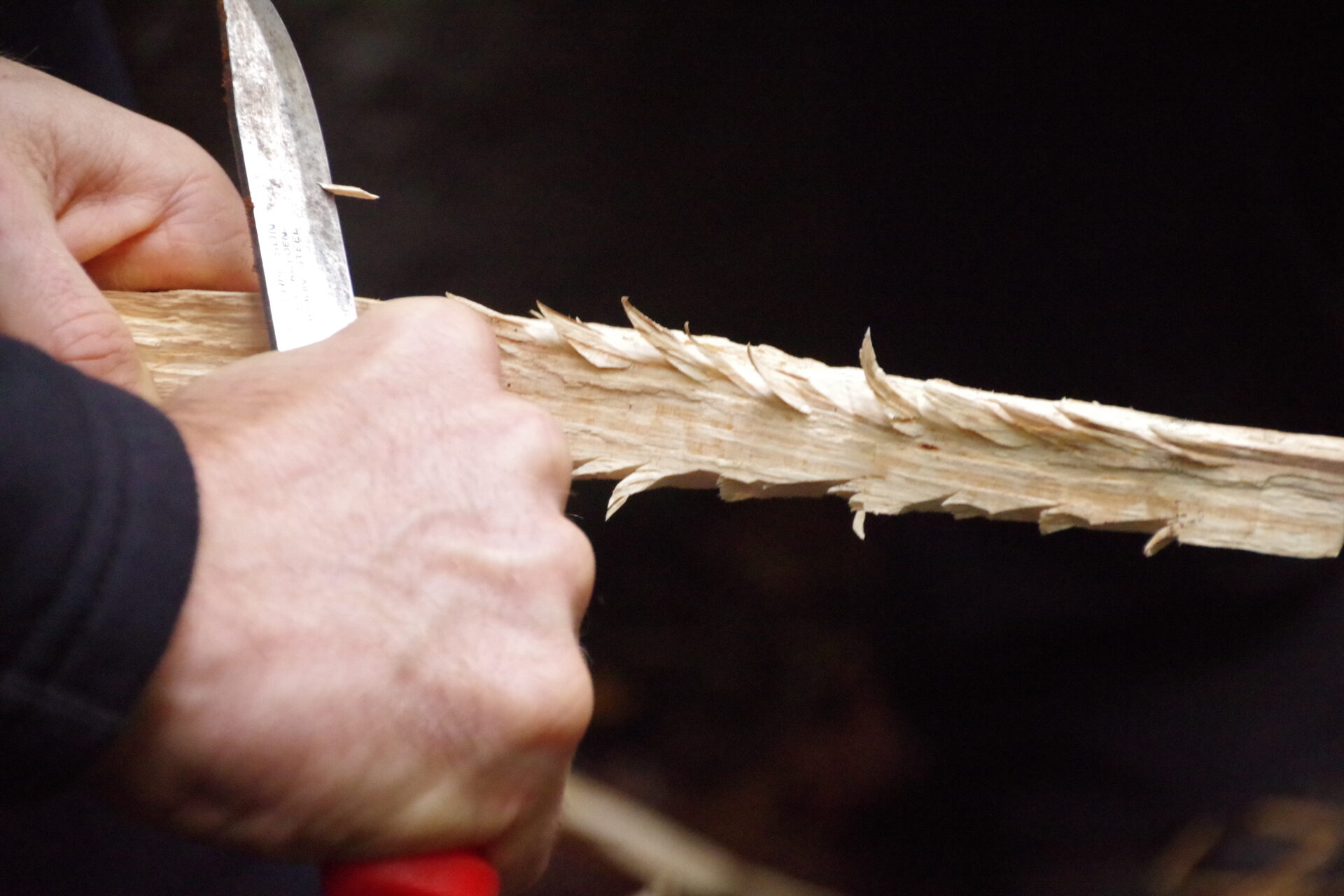 Damit es leichter anbrennt, schneidet man kleine Federn ins Holz. -