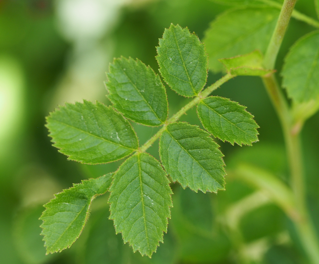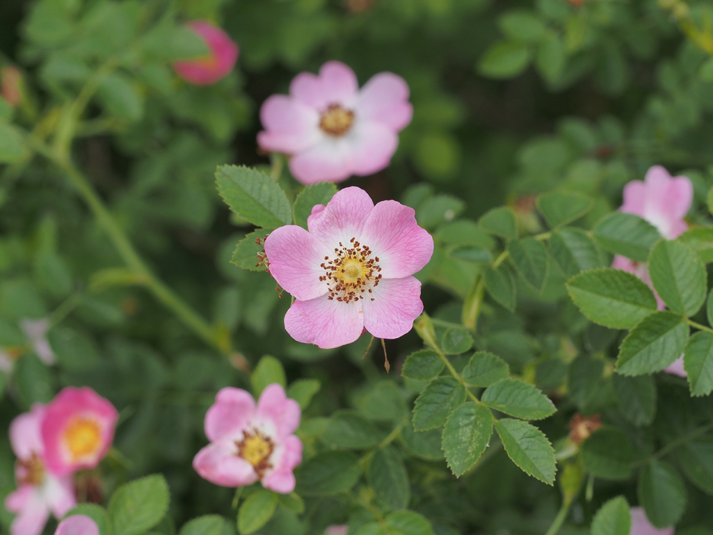 Die Blätter der Hagebutte werden als unpaarig gefiedert bezeichnet. Erinnert ihr euch an das Mädesüß? Wie bei ihm sitzen sich auch hier die am Rande gezähnten und spitzigen Einzelblätter am Blattstiel paarweise gegenüber und schließen am Ende mit einem Einzelblatt ab. Schaut ihr euch die Familie der Rosengewächse näher an, werdet ihr feststellen, dass sich ihre Blüten fast immer aus fünf Blütenblättern oder einem Vielfachen von fünf zusammensetzen. Wer also Lust auf Mathematik bekommt, kann nachzählen. Auch bei der Hagebutte sind es fünf hellrosa bis weiße Blütenblätter, die eine ungefüllte, nicht duftende Blüte ausmachen. Ihre Blütezeit reicht von Mai bis in den Juni hinein.