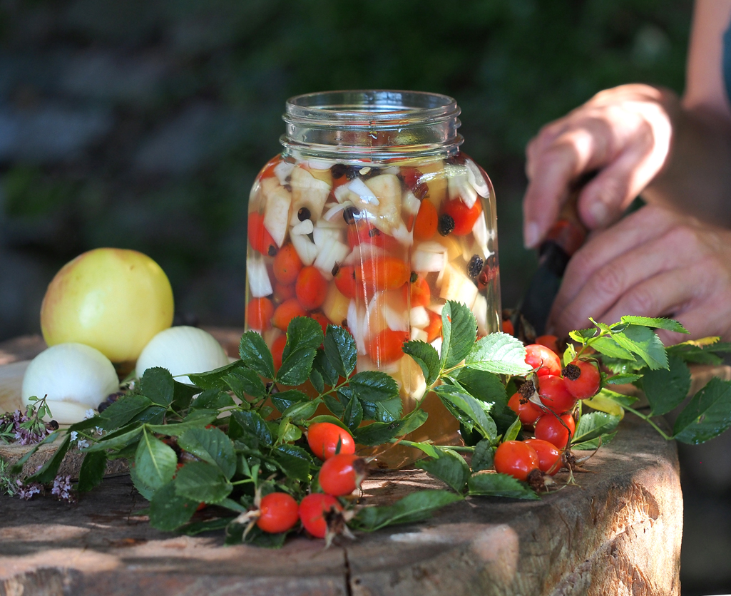 - verschiedene Wild- und Gartenfrüchte wie Hagebutten, Schlehen, Weißdorn, Apfel