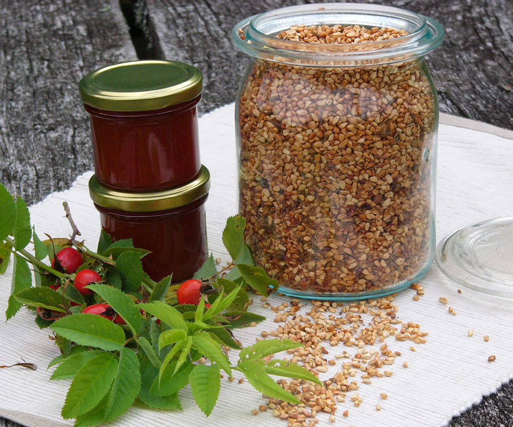 Der beste Erntezeitpunkt der Hagebutten ist nicht, wie bei anderen Wildfrüchten, wenn Frost darüber gegangen ist, sondern im Spätsommer bis in den frühen Herbst, sobald die Früchte reif und rot, aber auch noch fest sind, denn dann haben sie am meisten Vitamin C. Ihr könnt sie frisch verwenden oder für den Wintervorrat die ganzen Hagebutten, die halbierten Früchte ohne Kerne und Borstenhaare oder die gewaschenen Kerne trocknen.