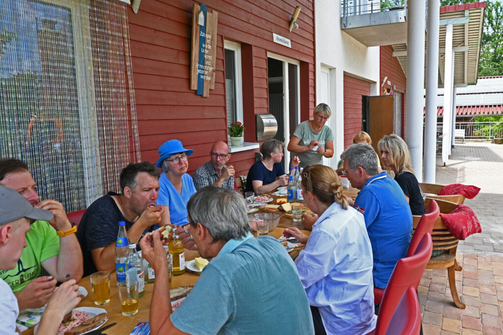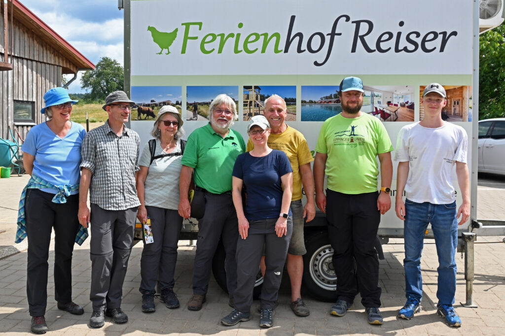 Beim Biolandhof Reiser, ebenfalls Naturpark-Partner, wartete bereits das Ehepaar Horst und Elke Reiser mit einer kleinen Stärkung auf die Gruppe. Horst Reiser erklärte, dass in einer Handvoll Humus mehr Lebewesen leben als Menschen auf der Erde. Diese Erkenntnis bewegte ihn nach der Hofübernahme in den 1980er Jahren dazu, auf biologische Landwirtschaft zu setzen, aus Respekt vor diesem unersetzlichen Leben. „Ohne dieses Leben im Boden ist ein Leben auf dem Boden überhaupt nicht möglich“, so Reiser. Deshalb verzichtet er von Anfang an auf alles, was dem Leben im Boden Schaden zufügen kann. Anfangs wurde seine Herangehensweise als Spinnerei abgetan. „Der wird schon sehen was passiert, wenn erst die Disteln auf seinen Feldern wachsen“, hieß es im Kreise seiner Kollegen. Die Familie Reiser hat es trotz etlicher Rückschläge durchgezogen und heute haben sie diese Probleme im Griff.