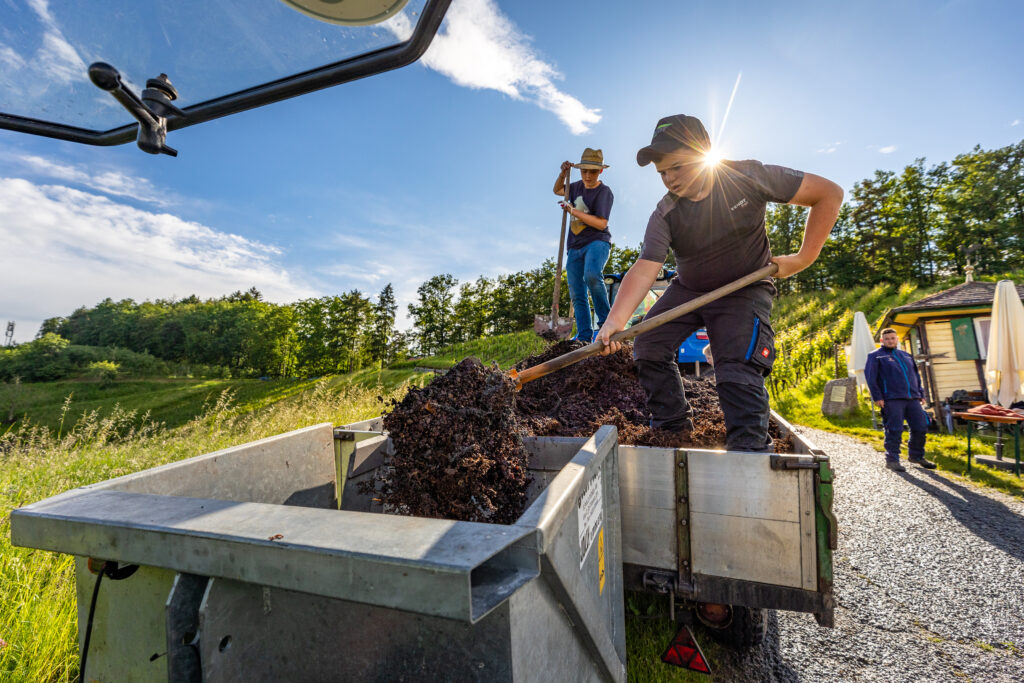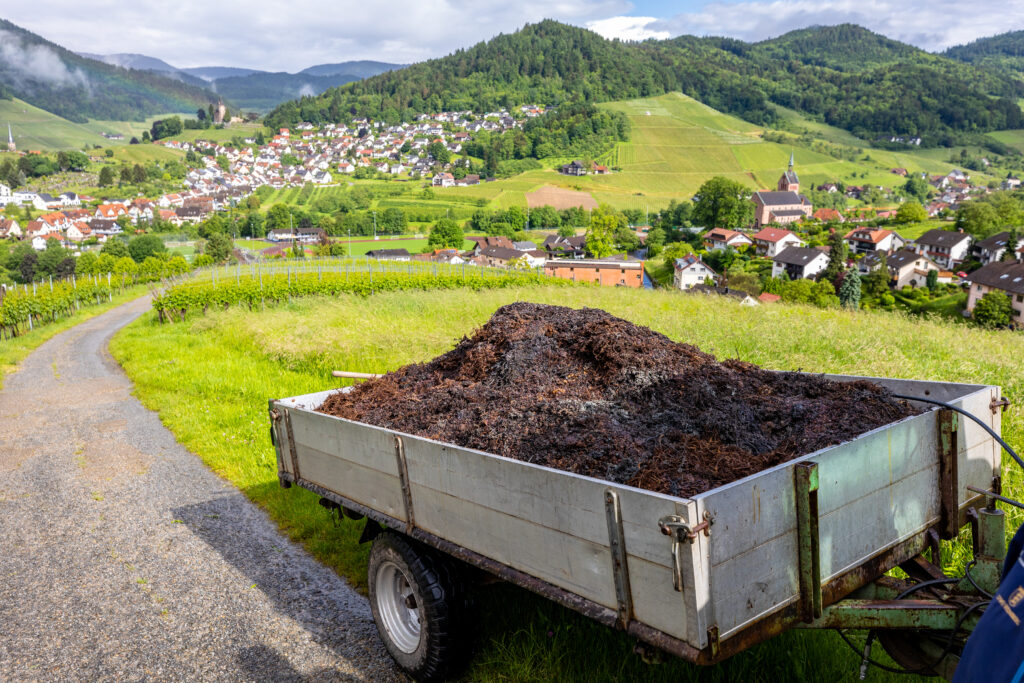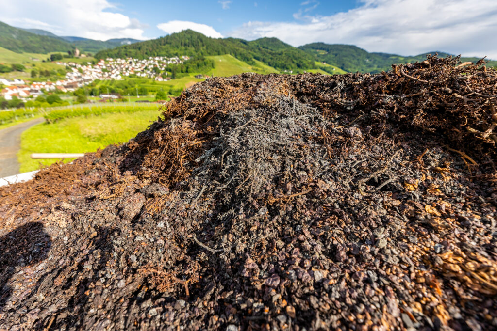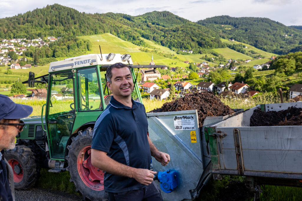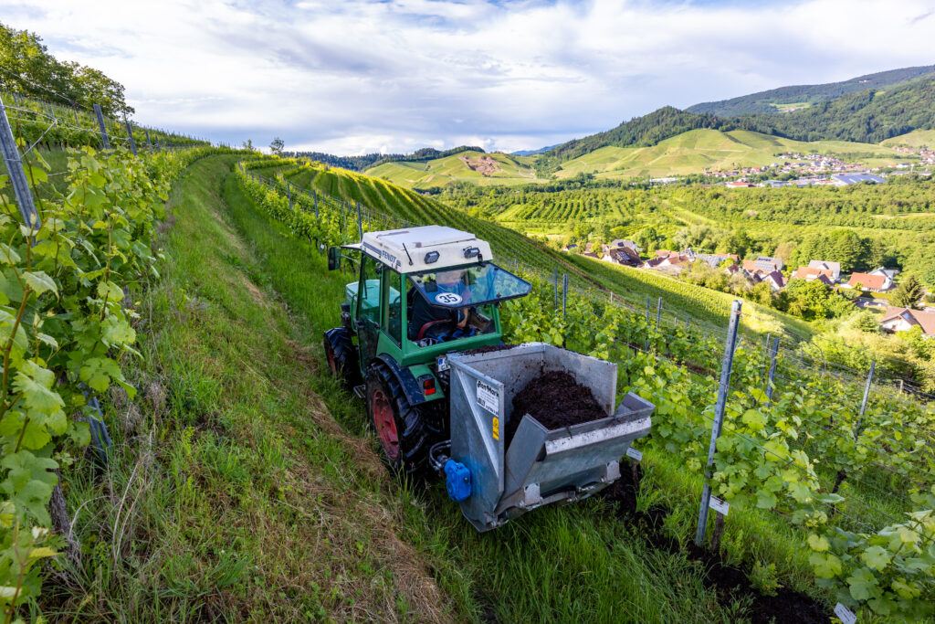 Der Humusaufbau ist eine Maßnahme, um Böden an das Klima anzupassen. Ein Boden mit einem hohen Humusanteil ist locker und nährstoffreich. Er erhöht die Wasserspeicherkapazität, bindet klimaschädliches CO2 und sorgt für mehr Biodiversität. Die Waldulmer WG stellt ihren biologischen Dünger durch Traubentrester her – das heißt den Abfällen, die beim Pressen der Trauben entstehen. Insgesamt bewirtschaften 120 Winzer der WG hundert Hektar Rebfläche an den zum Teil steilen Lagen der Vorgebirgszone des Schwarzwalds.