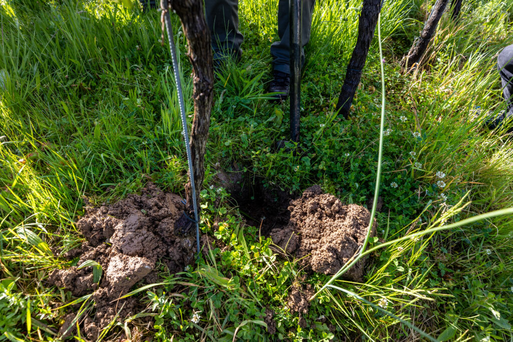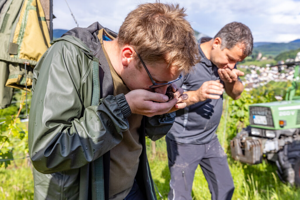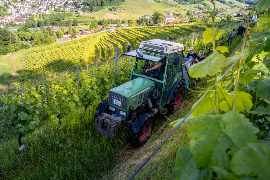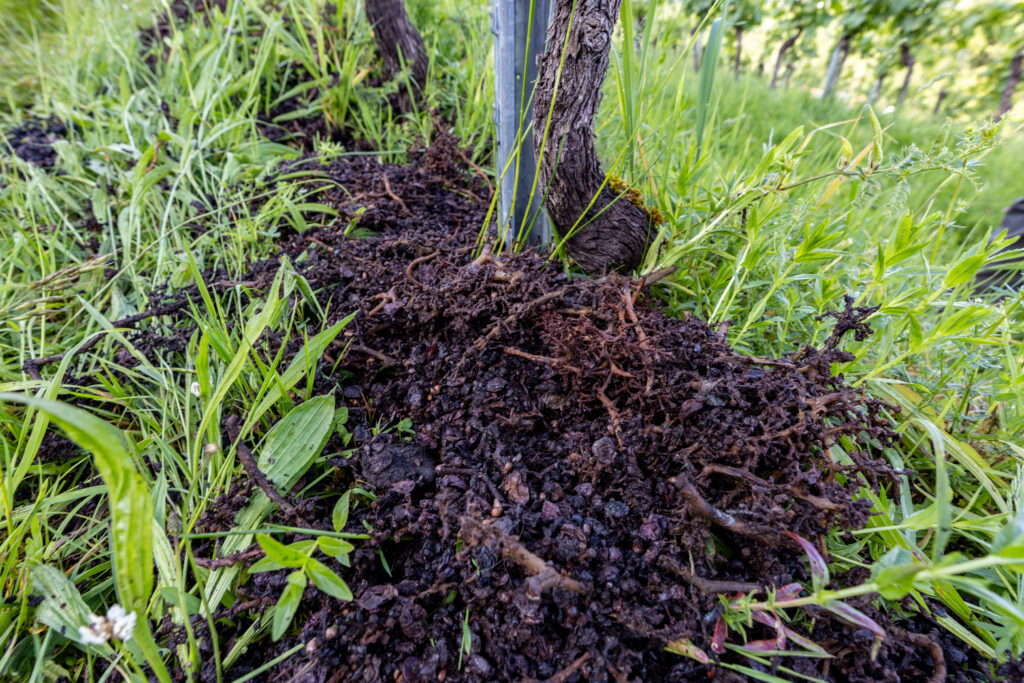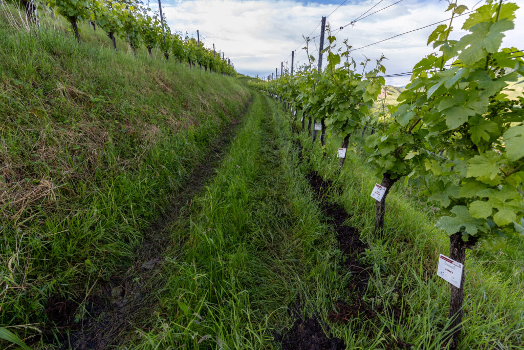 Der Humusaufbau ist eine Maßnahme, um Böden an das Klima anzupassen. Ein Boden mit einem hohen Humusanteil ist locker und nährstoffreich. Er erhöht die Wasserspeicherkapazität, bindet klimaschädliches CO2 und sorgt für mehr Biodiversität. Die Waldulmer WG stellt ihren biologischen Dünger durch Traubentrester her – das heißt den Abfällen, die beim Pressen der Trauben entstehen. Insgesamt bewirtschaften 120 Winzer der WG hundert Hektar Rebfläche an den zum Teil steilen Lagen der Vorgebirgszone des Schwarzwalds.