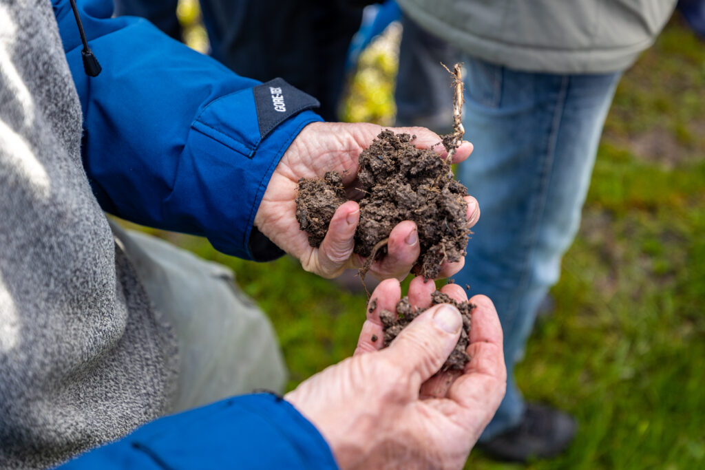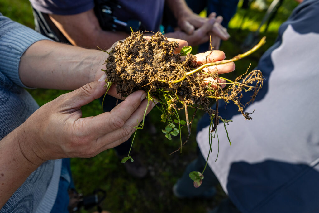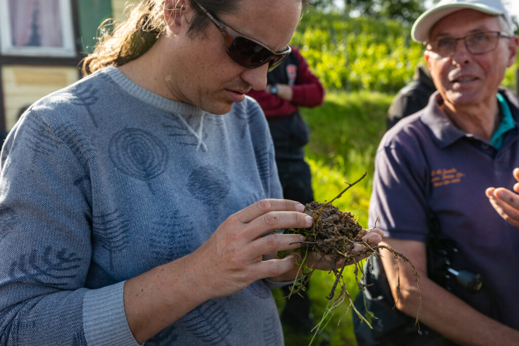 Josef Engelhart beschäftigt sich seit zehn Jahren intensiv mit dem Thema Boden. „Aktuell sind die meisten Weinbergböden sehr verdichtet und stark gehemmt in ihrer biologischen Aktivität“, sagt Engelhart in seinem Vortrag „Guter Wein braucht einen durch und durch lebendigen Boden“ beim Humus-Feldtag. Das hat zur Folge, dass der Boden Wasser nicht mehr optimal aufnehmen kann. Dies ist sowohl bei Starkregen als auch bei Hitzeperioden schlecht: Im ersten Fall muss das Wasser größtenteils oberirdisch abfließen. Es kann nicht im Boden versickern und gespeichert werden. Zudem werden wichtige Nährstoffe weggeschwemmt. Im zweiten Fall fehlen die gespeicherten Wasserressourcen im Boden, um für eine Hitzeperiode besser vorbereitet zu sein.