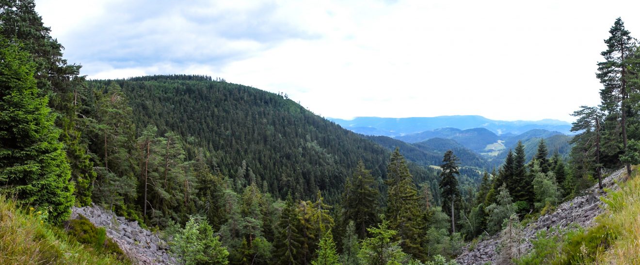 Hier befindet sich auf dem 1871 errichteten Bismarckturm eine kleine Aussichtsplattform, von wo aus man in westlicher Richtung einen herrlichen Blick über die Rheinebene bis hinüber in die Vogesen hat. Auch sonst bildet die Hornisgrinde ein einzigartiges und schützenswertes Biotop. Entlang des Grindenpfads finden sich zahlreiche Lehrtafeln mit vielen Informationen zur speziellen Flora und Fauna der Hornisgrinde. Da uns unser Weg von hier aus hinunter zum Seibelseckle führte, hatten wir zwei nicht minder attraktive Alternativen für unseren Abstieg. Zum einen konnten wir über den Bohlenweg durch das Hochmoor zum Dreifürstenstein gehen, dem mit 1.154 Meter ü.M. höchsten Berg Württembergs. Von dort aus dann steil hinab auf einem steinigen Pfad mit einer herrlichen Aussicht hinunter zum Seibelseckle.
