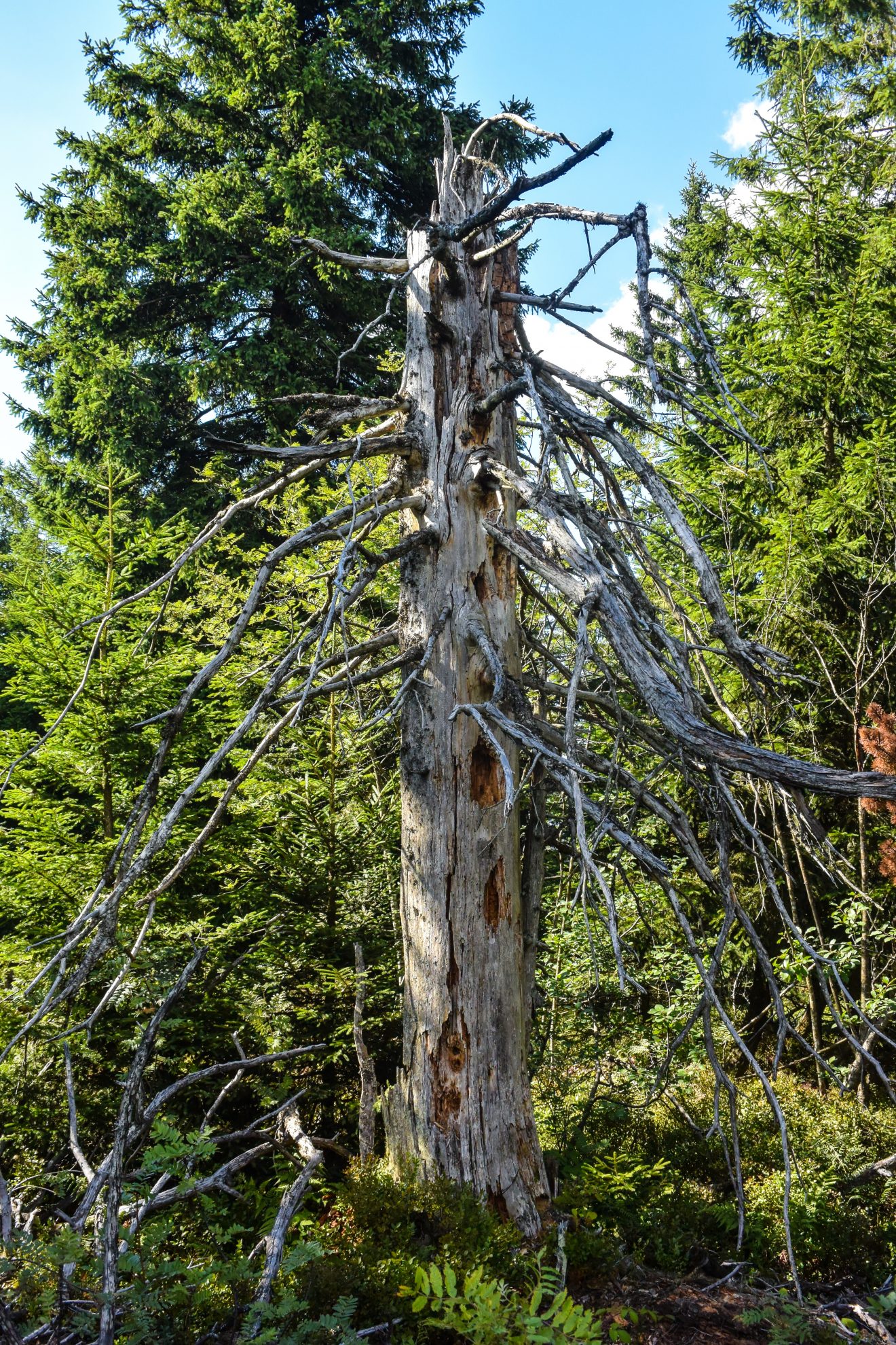 Trotz meines unruhigen Schlafs wachte ich am frühen Morgen überraschend ausgeruht auf. Meine beiden Begleiter schliefen allerdings noch fest, weshalb ich mich an den Rand unserer Plattform setzte und die Farben, Geräusche und Gerüche des Waldes auf mich wirken ließ. Vor Kurzem habe ich gelesen, dass findige Marketingmenschen genau dafür den Begriff „Waldbaden“ entwickelt haben. Es hatte auf jeden Fall eine sehr beruhigende, entspannende und fast schon meditative Wirkung, die mich die Zeit fast gänzlich vergessen ließ. Etwas später, als wir alle zusammen beim Frühstück saßen, machte ich meinen beiden Begleitern den Vorschlag, sich das nahegelegene Kloster Allerheiligen und die berühmten Wasserfälle im Lierbachtal anzusehen. Da ich auch dort bereits des Öfteren war, erklärte ich mich bereit, in dieser Zeit die Ausrüstung abzubauen und einzupacken. Für mich war dieser Tag leider der letzte der Tour, da ich am nächsten Tag wieder zur Arbeit musste. Da wir uns bislang auf dem Westweg sehr wohl gefühlt hatten, überlegten wir, ob wir unseren gestrigen Weg bis zum Schliffkopf zurücklaufen sollten, um von dort aus wieder der roten Raute zu folgen.