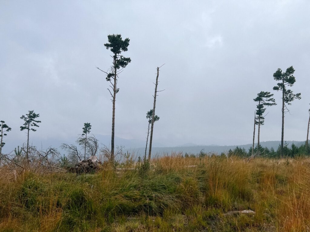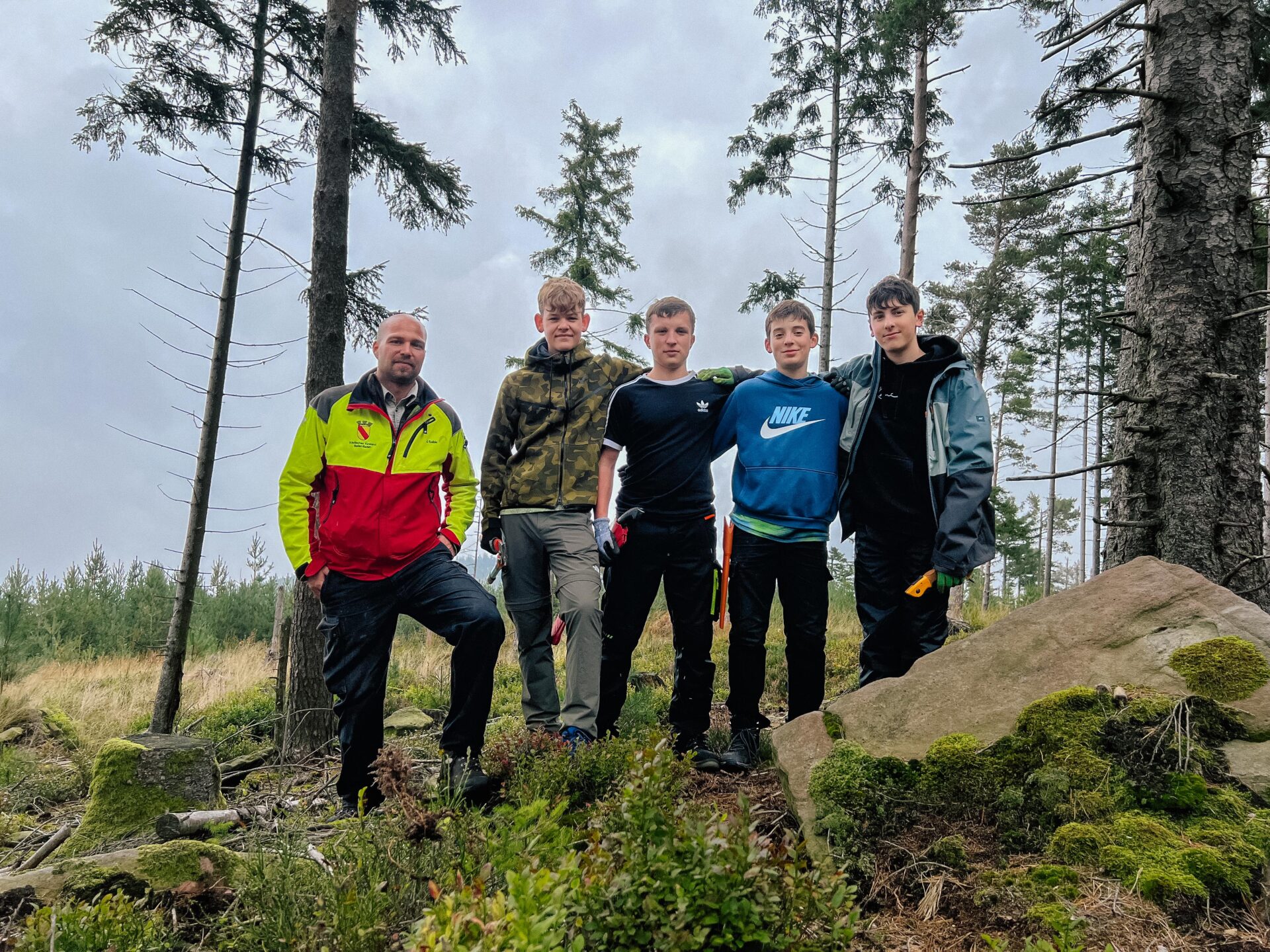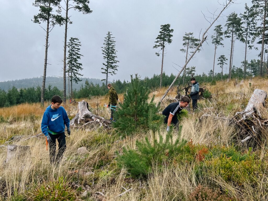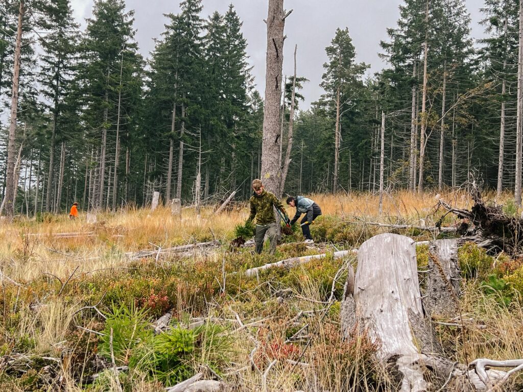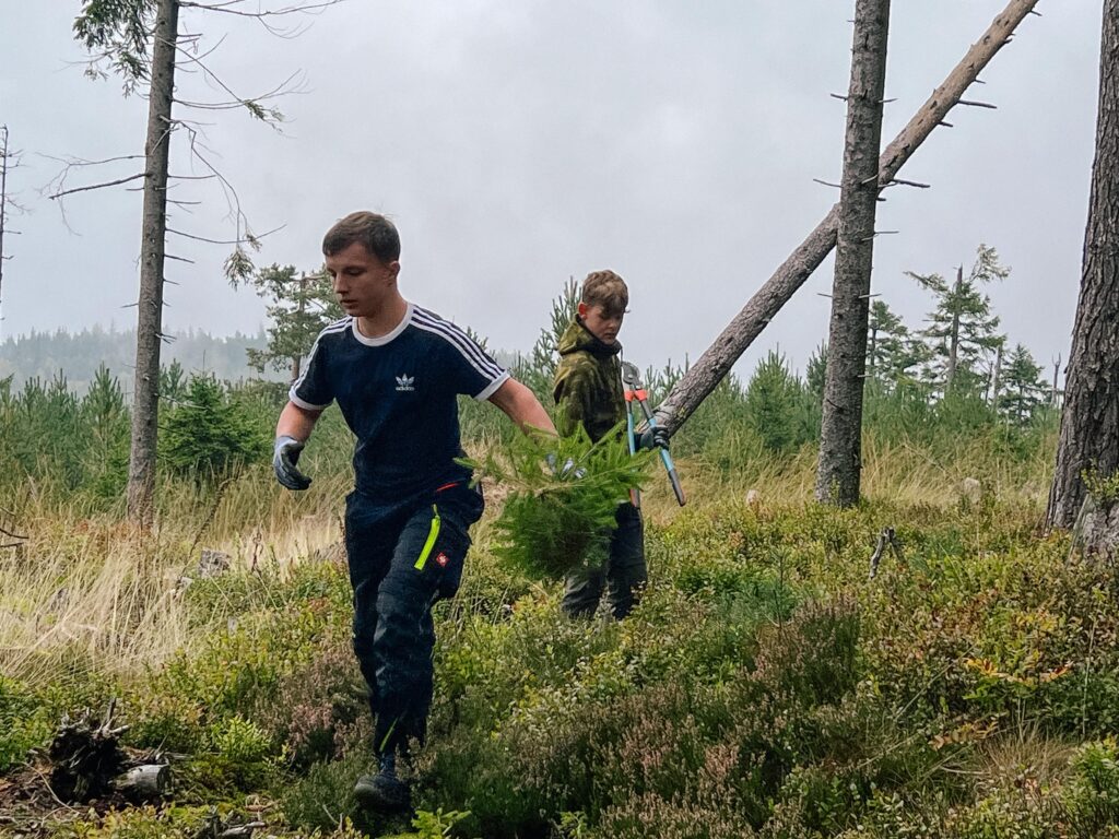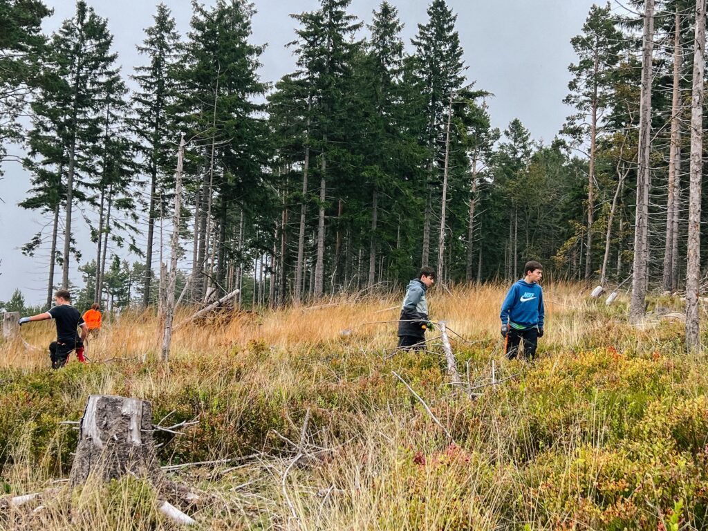 Die jungen Helferinnen und Helfer zogen kniehohe Fichtentriebe von Hand aus dem Boden. Ältere Bäume entfernten sie mit Sägen, darunter vor allem Fichten. Denn die Beeren der Eberesche, die Nadeln der Kiefer und die Triebe der Birke gehören zur Lieblingsnahrung des Auerwilds.