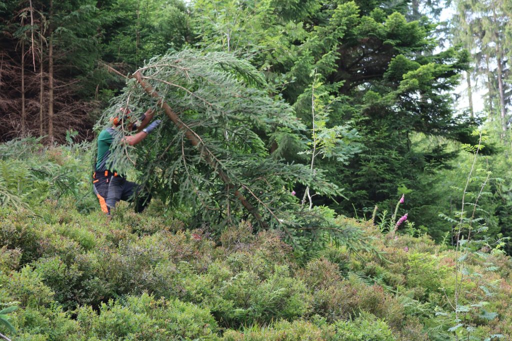 Gerade der junge Wald wächst sehr dicht. Junge, etwa kniehohe Triebe können die Helferinnen und Helfer noch von Hand aus dem Waldboden reißen. Größere Bäume werden abgesägt. „Wir fällen insbesondere Fichten. Denn die Triebe der Birke, die Nadeln der Kiefer sowie die Beeren der Eberesche frisst das Auerwild sehr gerne“, erklärt Lang.