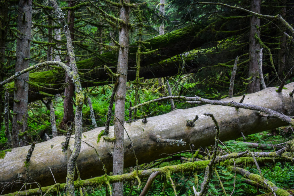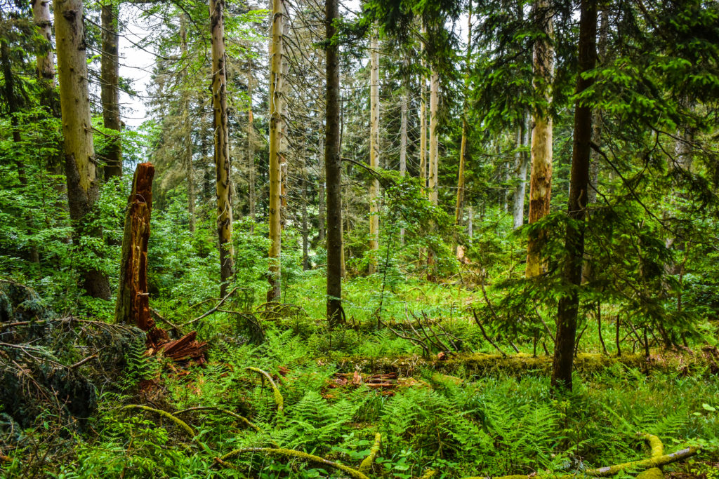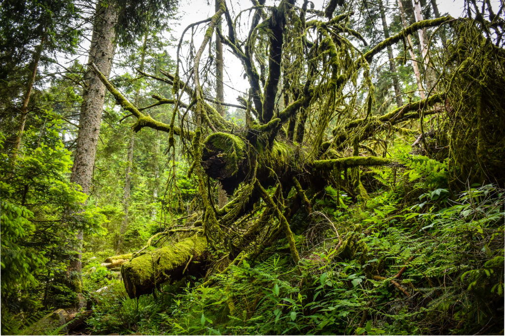 Durch urigen Wald mit umgestürzten Bäumen geht es die Karwand hinauf. -