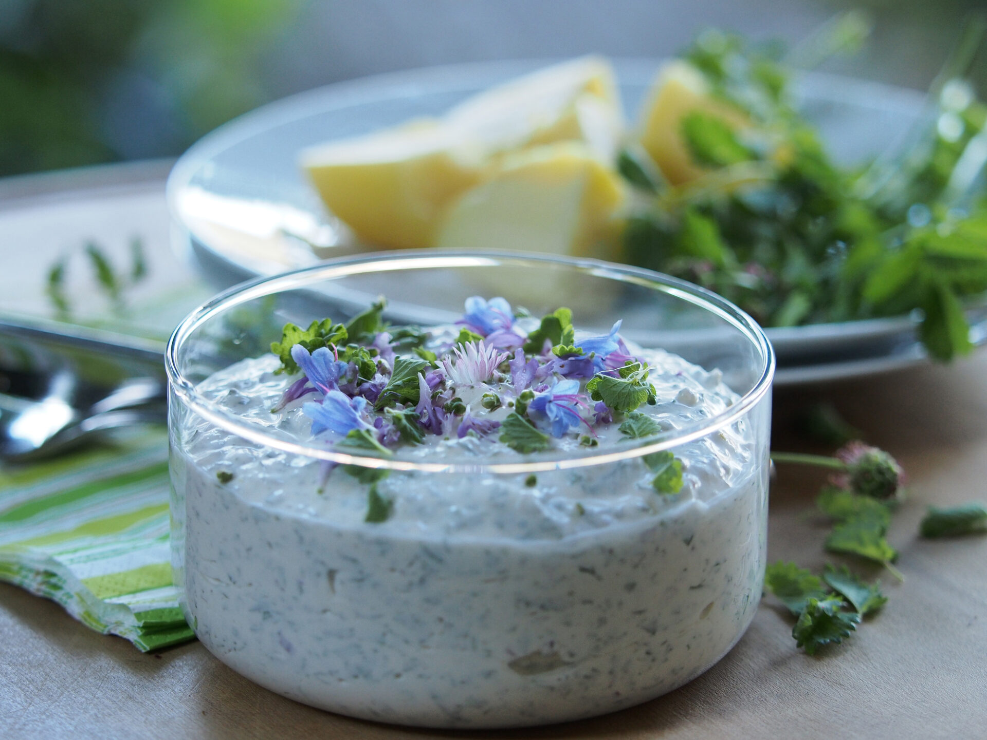 Den Quark rührt ihr mit Joghurt, Feta, Knoblauchzehe und dem Olivenöl cremig. Dann hebt ihr die fein gehackten Kräuter unter und würzt den Tsatsiki mit den Gewürzen kräftig ab. Zum Dekorieren könnt ihr Gänseblümchen, Königskerzen- und Nachtkerzenblüten verwenden oder blaue Blüten von Borretsch und Natternkopf. Dazu passen Weißbrot oder Pellkartoffel!