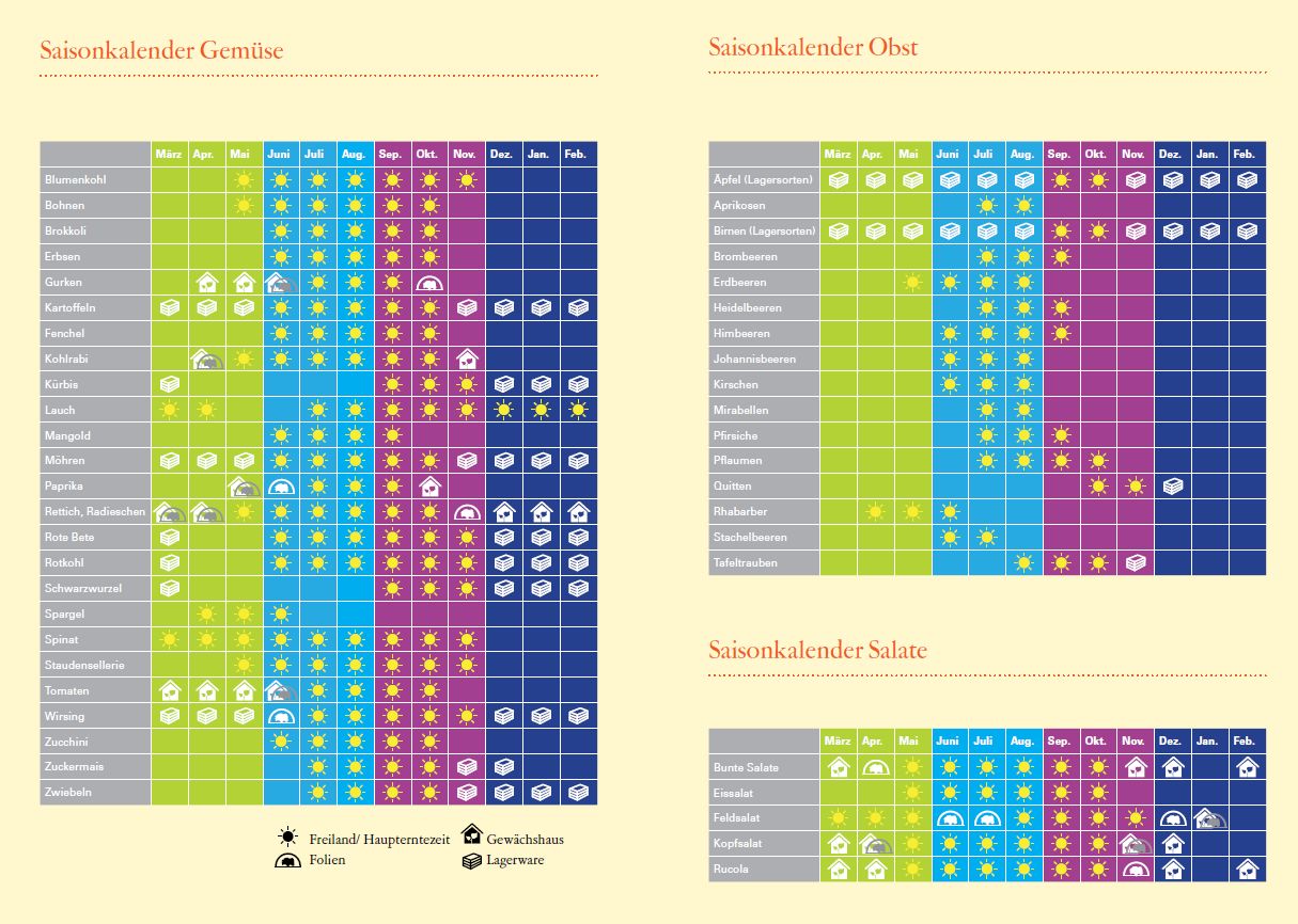 Aus dem Supermarkt sind wir es gewöhnt, dass Lebensmittel das ganze Jahr zur Verfügung stehen. Nur wenige von uns wissen deshalb noch, welches Obst und Gemüse bei uns zu welcher Jahreszeit wächst oder als Lagerware zur Verfügung steht. Dabei gibt es selbst in den Wintermonaten tolle heimische Gemüsesorten, mit denen ihr euch gesund und genussvoll ernähren könnt. Grünkohl, Rosenkohl, Feldsalat, Chicorée und Lauch kultivieren die Landwirtinnen und Landwirte im Rheintal beispielsweise auch während der Wintermonate im Freilandanbau und sind deshalb erntefrisch verfügbar. Weitere Kohl- und Kürbisarten, Kartoffeln und Karotten gibt es in der Region angebaut. Sie sind gut zu lagern und bereichern den Speiseplan in der kalten Jahreszeit. Jetzt im April lassen sich zudem die ersten Radieschen, Spargel, Spinat und Rhabarber ernten. Wann welches Obst und Gemüse im Freiland oder Gewächshaus reif ist und welches Gemüse gut zu lagern ist, könnt ihr im Saisonkalender der Nachhaltigkeitsstrategie Baden-Württemberg sehen.